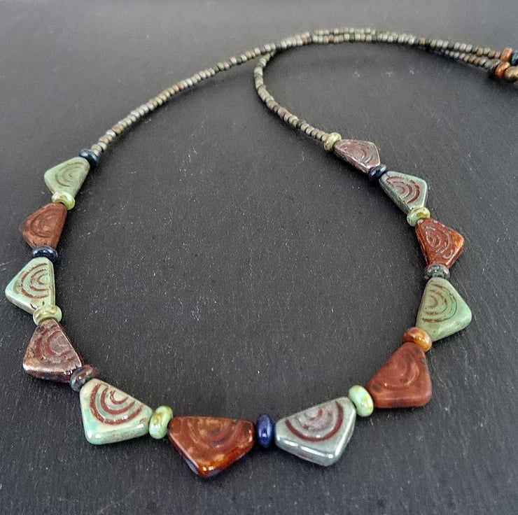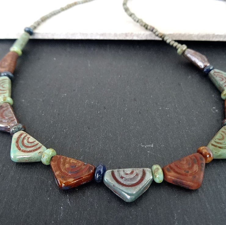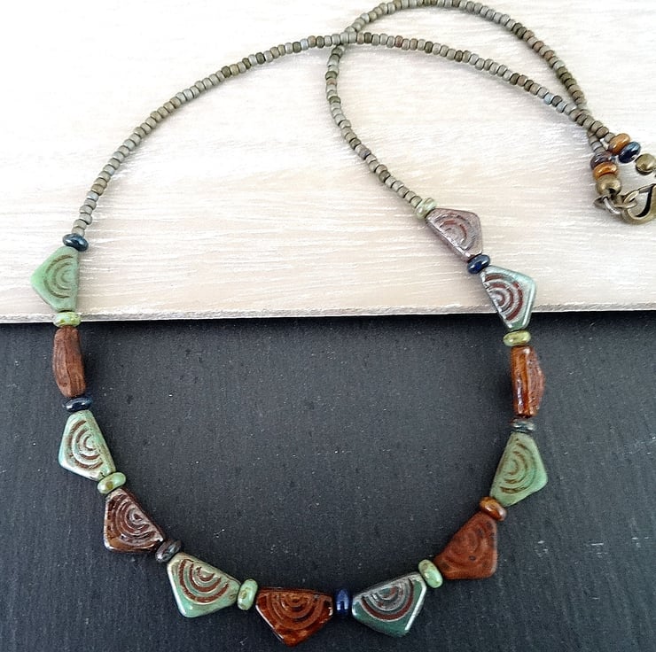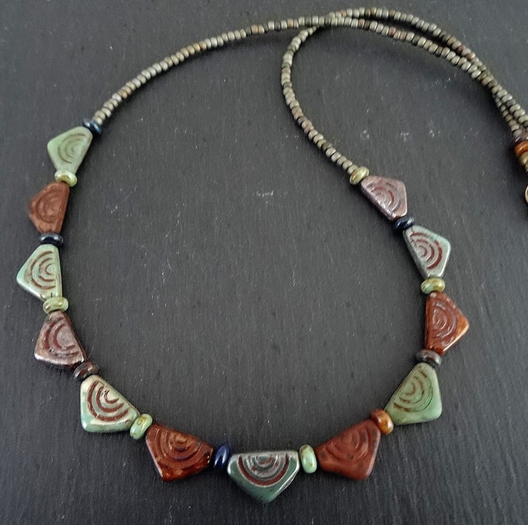 This is a lovely necklace made with bunting shaped tribal style czech glass beads. I have added complimentary coloured czech glass seed beads. The colours are greens, browns and blues and the measurement is 18 inches (46cm) and closes with a antique bronze coloured lobster clasp. As all of the items in my shop are unique, individual pieces made by myself, this is the necklace you will receive. It will arrive gift wrapped in tissue paper and a organza bag.