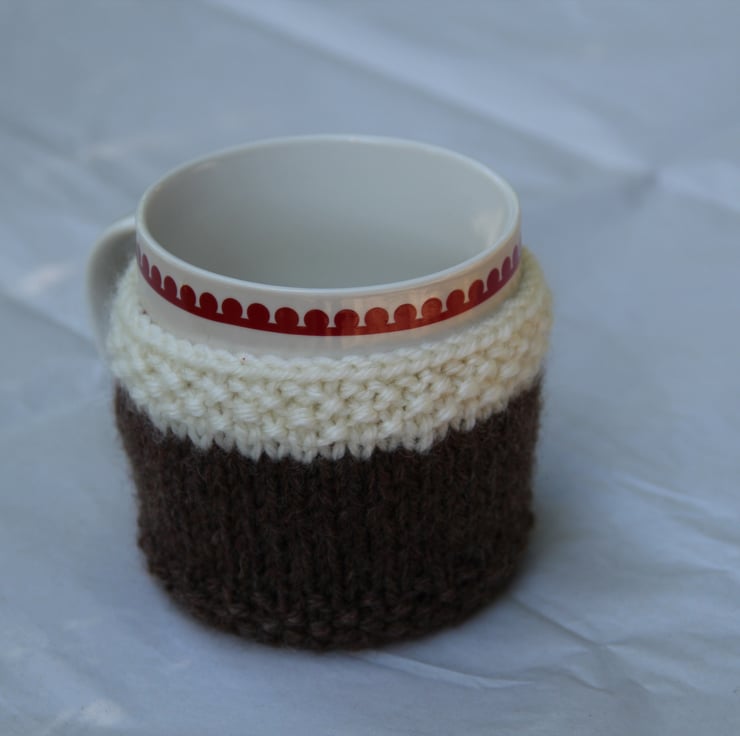 This hug is made for a mug of approximately 20-15cm circumference & is 7.5cm tall, so will fit most mugs. Knitted in lovely soft acrylic yarn, the hug is washable, so don't worry about the odd drip. The holly leaf is hand knitted and the berry is a shiny red button to ensure your hug is secure.