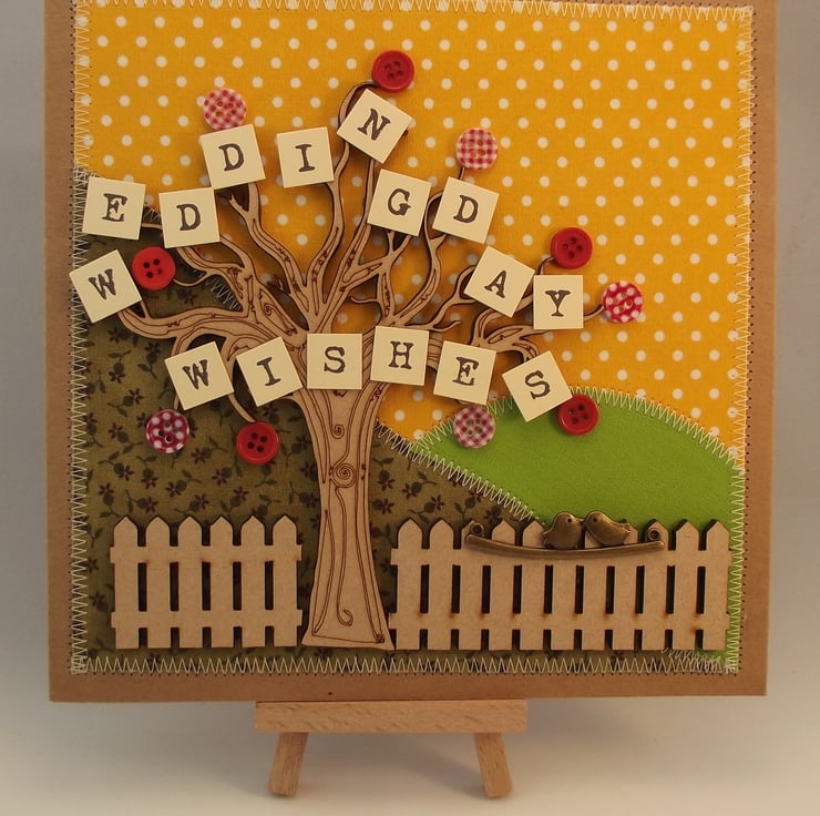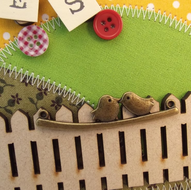 I have made the background of the card from fabric. The tree and fence are wooden. To finish the card off I have added handmade lettering, buttons and kissing birds.