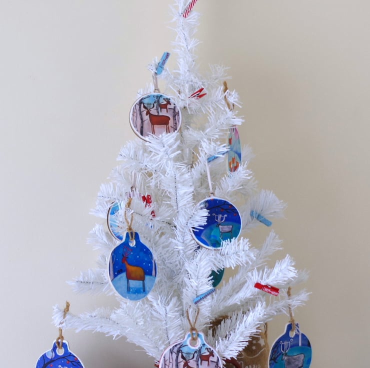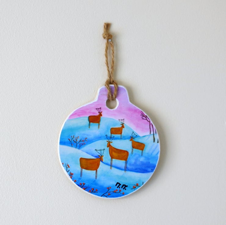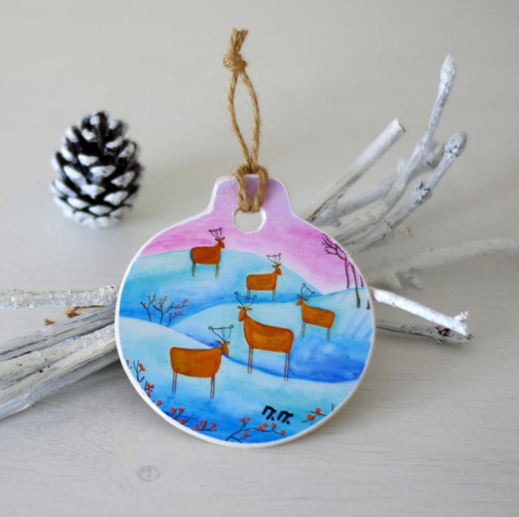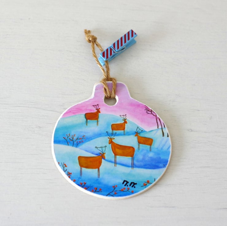 I made this whimsical ornament by mounting a print after one of my paintings on a wooden support. The ornament is approx 3.5" across and 3.8" long and it can be used as a Christmas tree ornament or as a winter decoration during the festive season.
