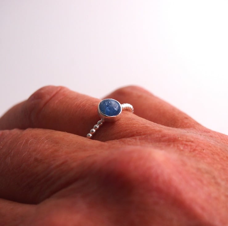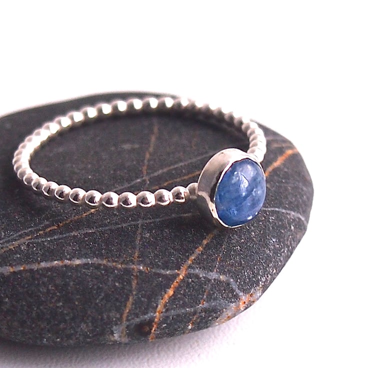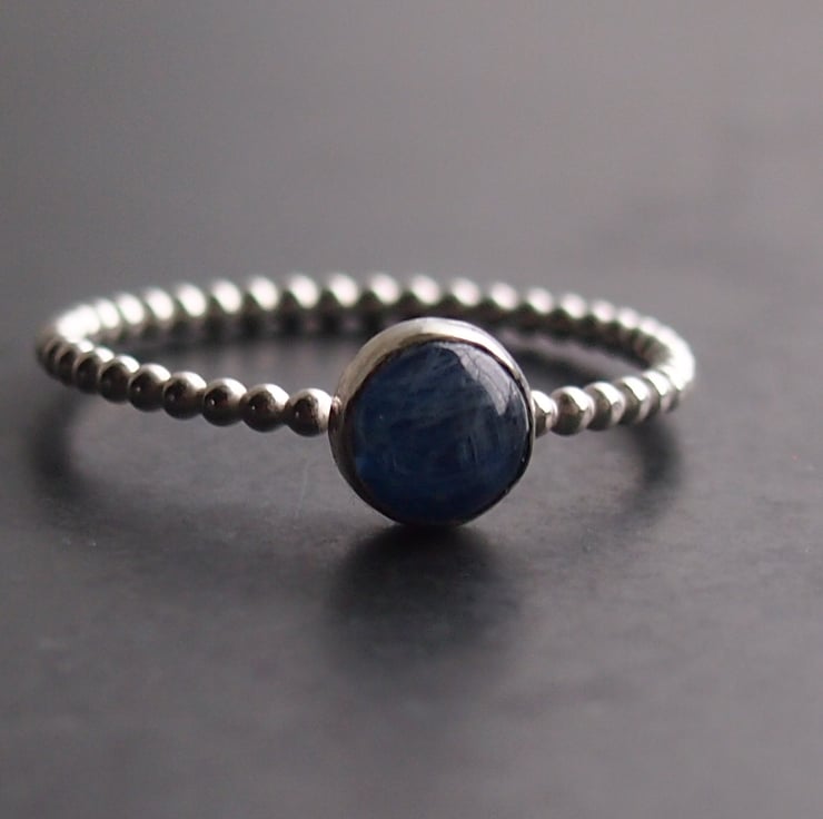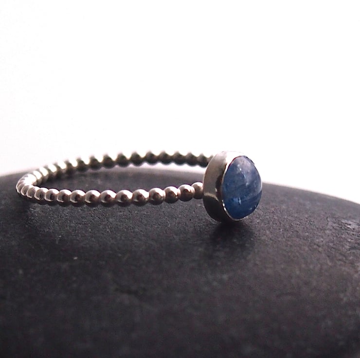 A delicate beaded sterling silver ring is set with a 6mm kyanite cabochon. A lovely soft sky blue stone.