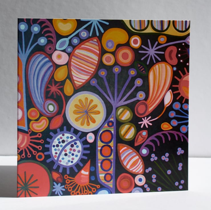 These vibrant greetings cards are printed in the UK on high quality card from recycled and well controlled sources. The design is a high resolution photograph of one of my large acrylic paintings of a range of seeds. Each 13.5cm square card comes packed in a cello bag with a pristine white envelope all ready for you to send off to someone to brighten their day!