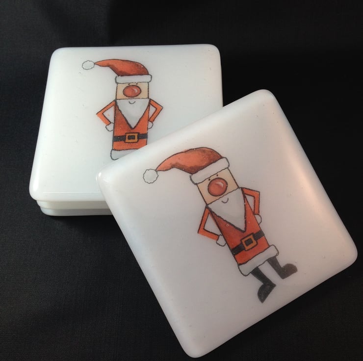 A festive set of 4 cartoon Santa coasters measuring approx 9cm square each. This fun Santa decal is fused between a white and clear layer of glass with an additional layer of fine glass powder to reduce naturally occurring bubbles. They are fused at 800 degrees Celsius over 11 hrs including an annealing process which strengthens the glass. Each coaster has 4 rubber bumpers underneath to avoid slips and scratches to furniture.