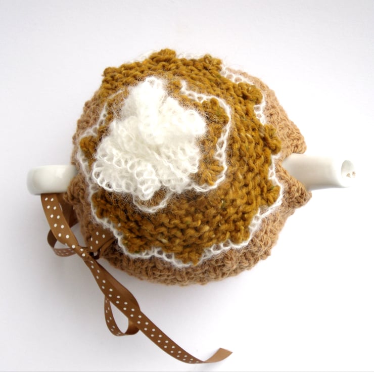 The tea cosy has been knitted in basket weave pattern and features a big bold mustard tweed wool rosette with a central white mohair flower