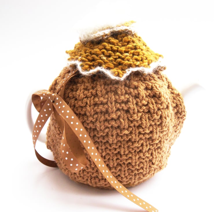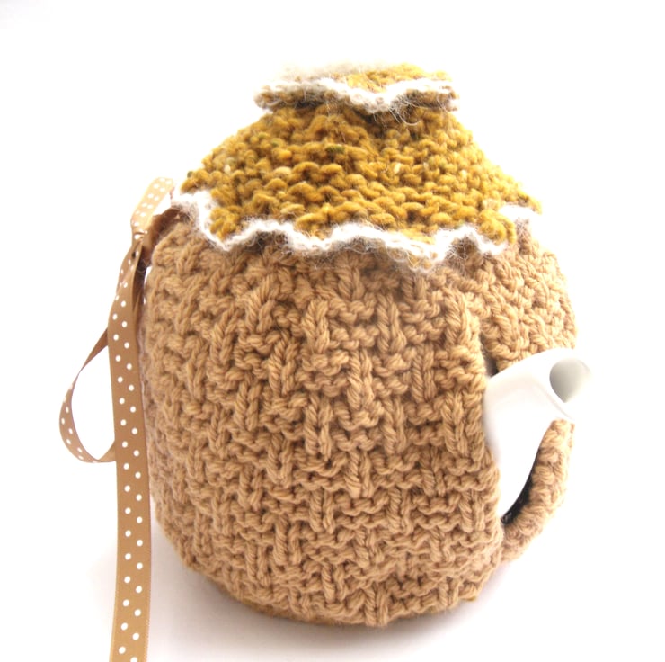 Trendy Tea Cosy hand knitted in chunky mustard organic (naturally dyed) wool yarn , 2 openings for the handle and spout.