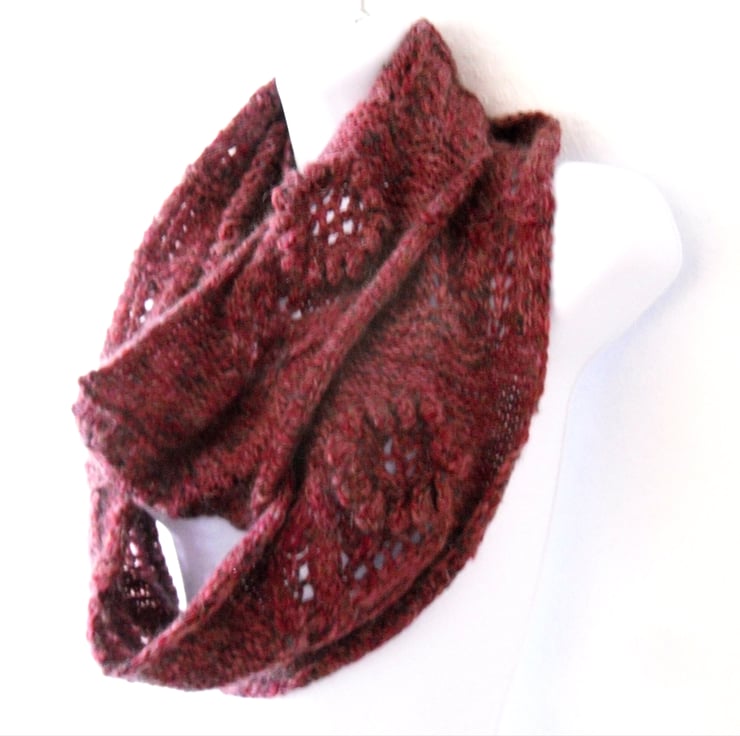 Gorgeous feminine long infinity scarf with feature flower detail. Hand knitted in Rowan colourspun yarn 72% wool , 14% mohair , 14% polyamide. Wonderful colour , lovely soft creation.
