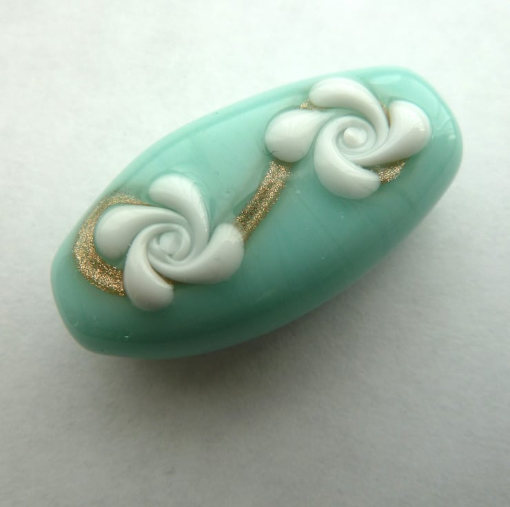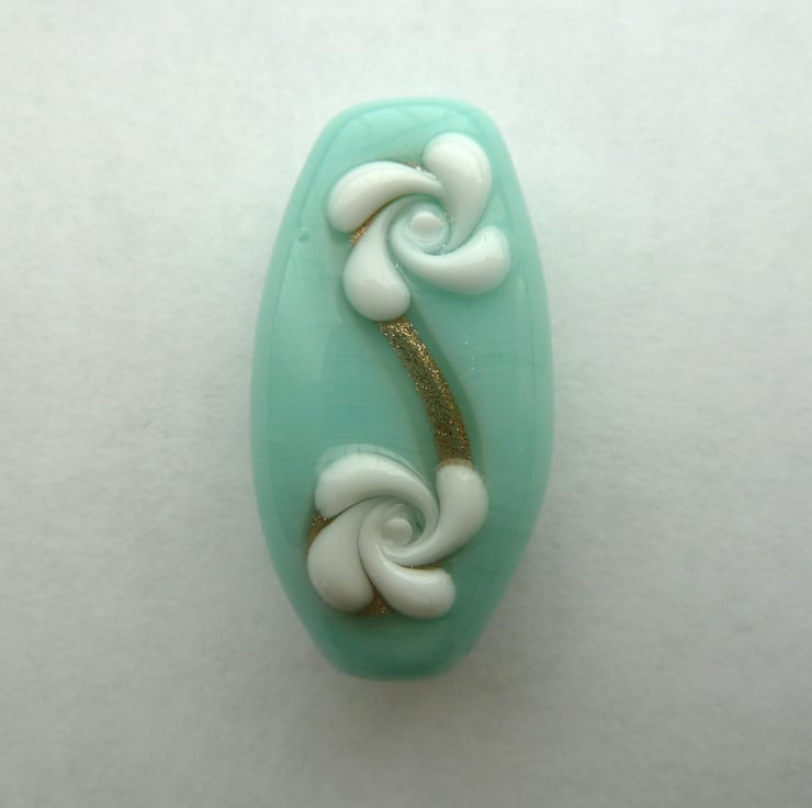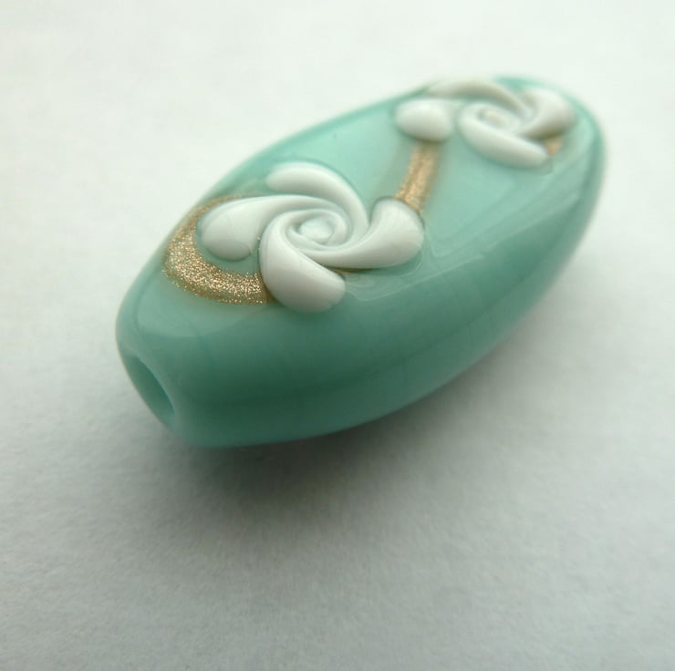A handmade lampwork glass bead which has been made with aqua glass and features a goldstone swirl with white flowers.