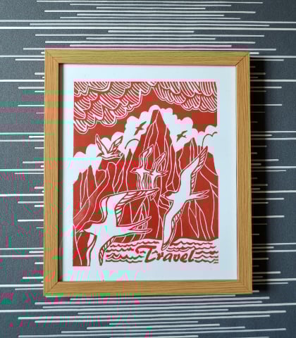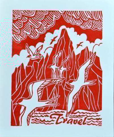 It's the arctic terns I saw on my recent trip to Iceland. They look like small seagulls but fly and glide through the air like swifts. However it's the fact that they are great migrant birds that inspired my prints-They fly from their Arctic bleeding ground to the Antarctic and back again each year.That's some traveling. I also added the text 'Travel' because I love old travel posters and wanted that retro look in my prints.