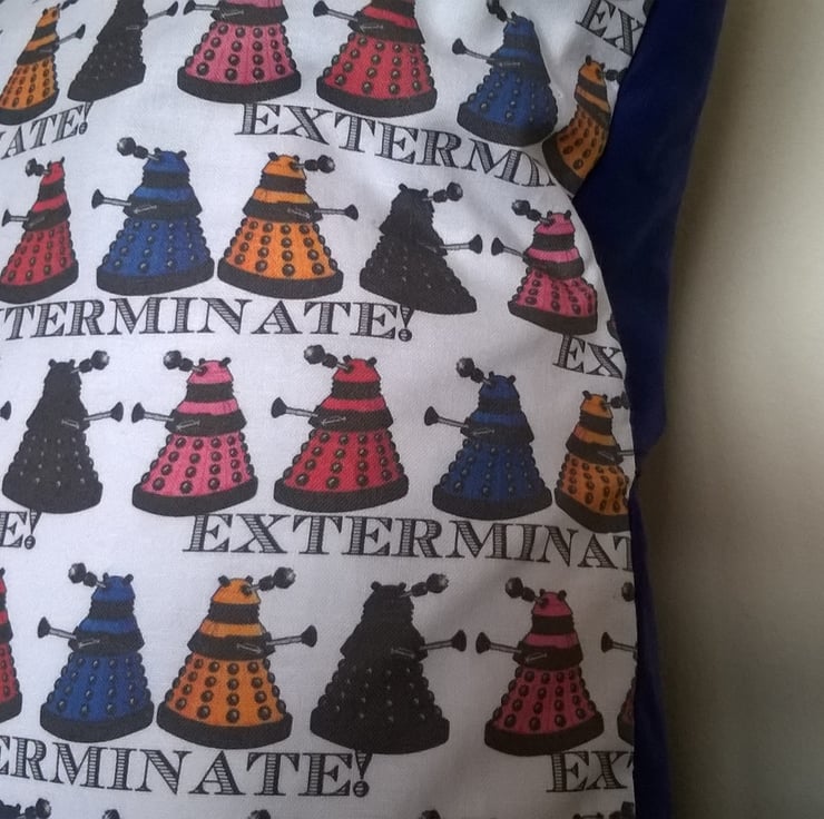 For all Dr Who fans, this fab cover features multi coloured Daleks in dusky pink, blue, black, red and orange.