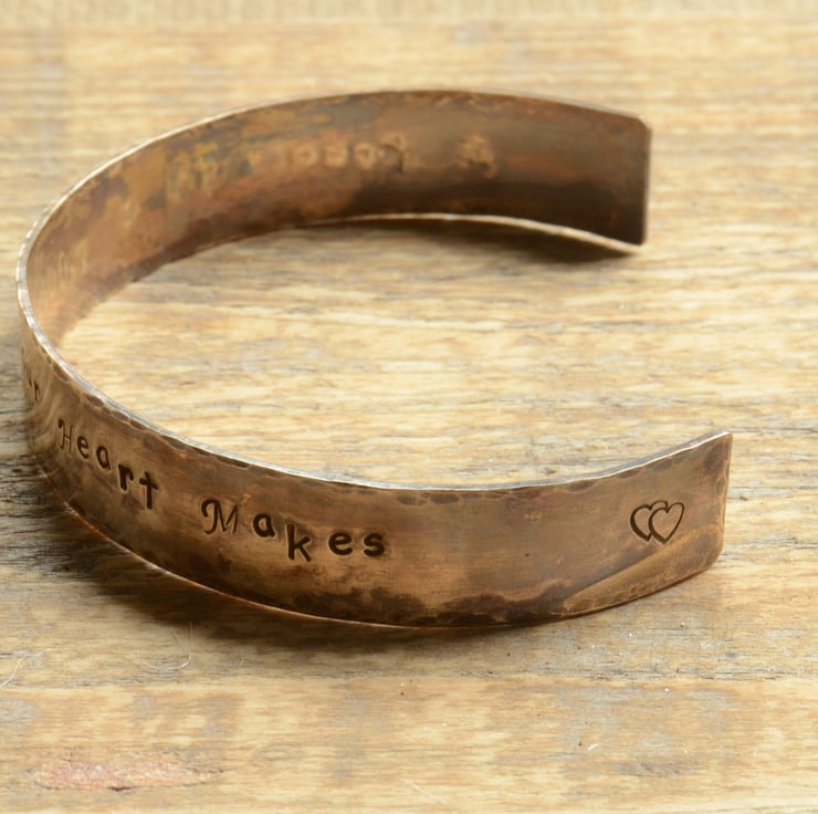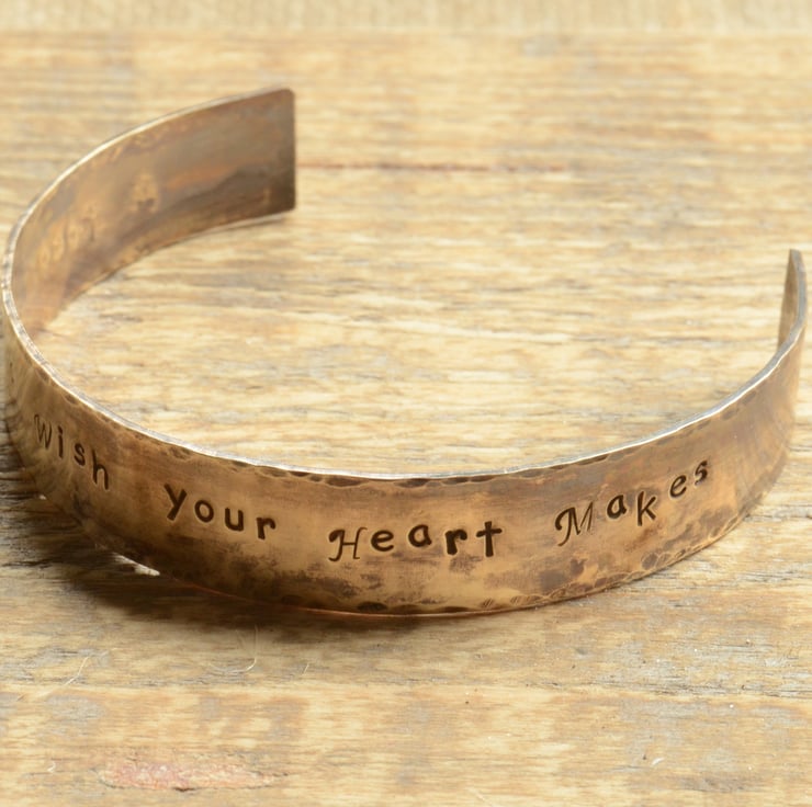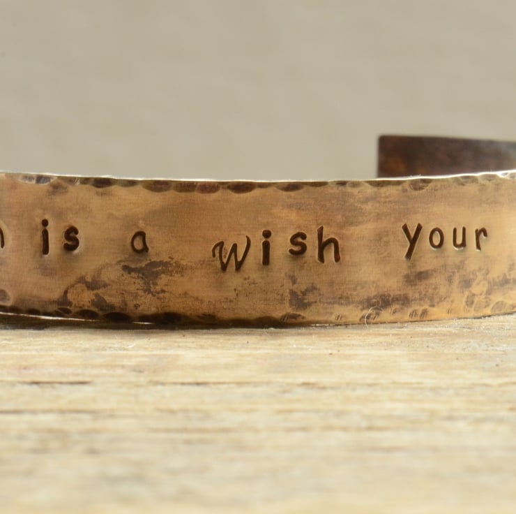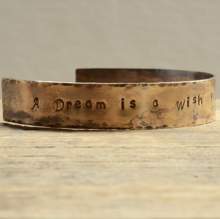I have hand stamped a brass cuff bracelet blank with the words "A Dream is a Wish Your Heart Makes" with little heart motif at the end.