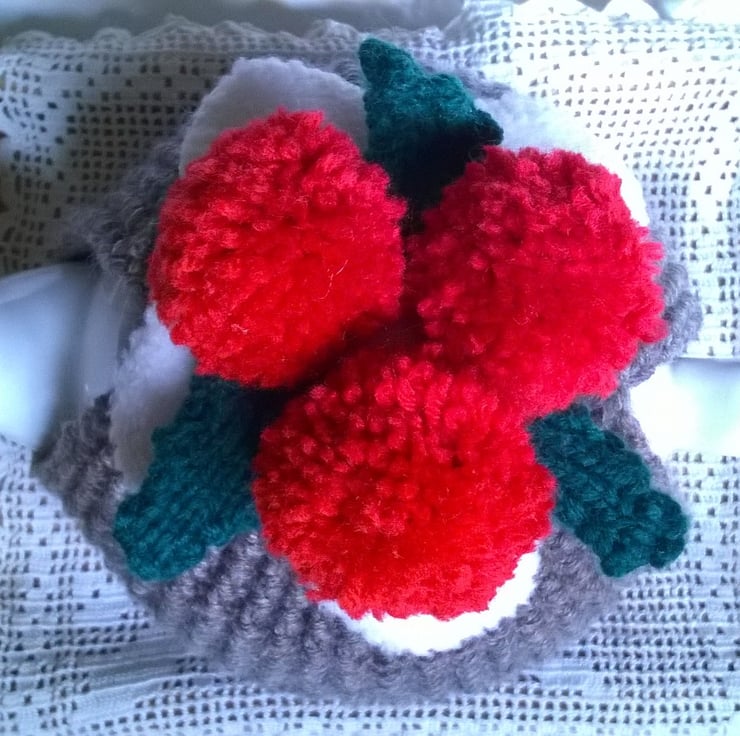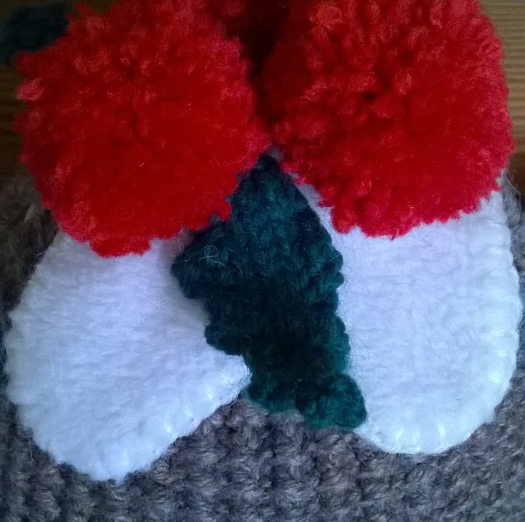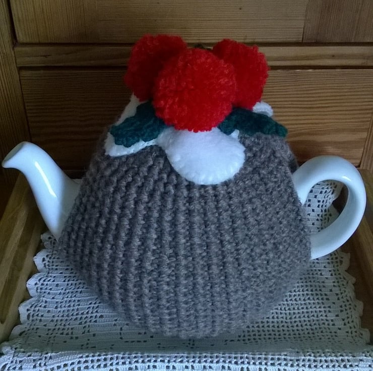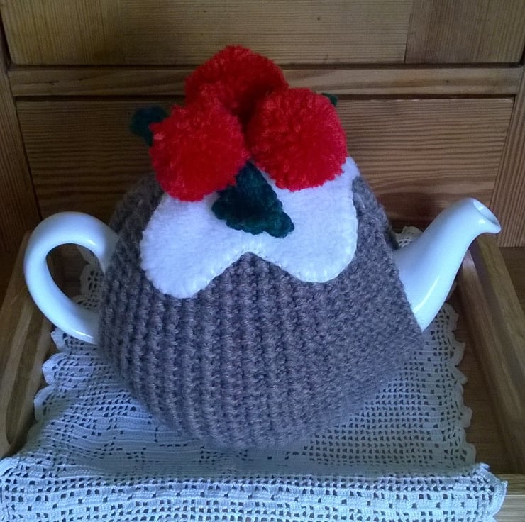 Knitted in a knobbly stitch using a brown tweed yarn to resemble the colours of the fruit and suet of a traditional Christmas pudding. Topped with a generous helping of light cream fleecey custard, and a sprig of knitted holly leaves and 3 red berry pompoms.