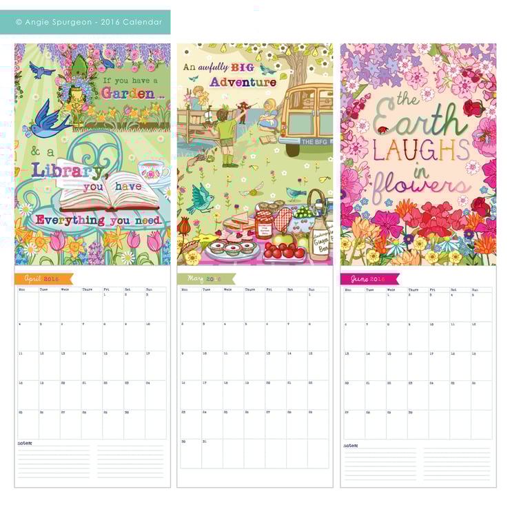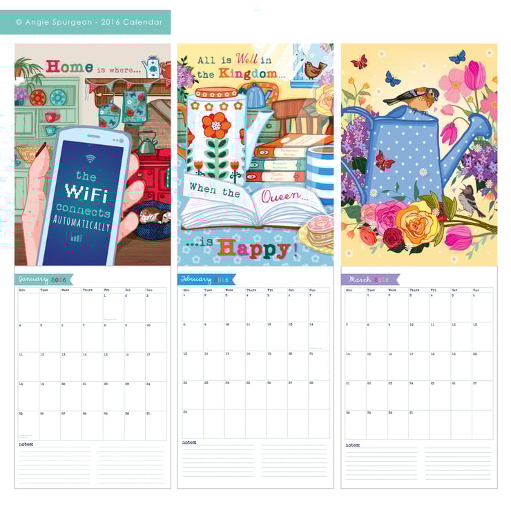 This is an A4 (297mmx 210mm) sized booklet style wall calendar. When hung, the top A4 page features a colourful illustration selected from my current collections - perfect for framing as prints once the calendar is finished. The bottom A4 page features the calendar which has plenty of space by each date to write appointments and reminders in. Throughout the calendar are a few key dates and bank holidays, very discretely typed at the bottom of the appropriate date.