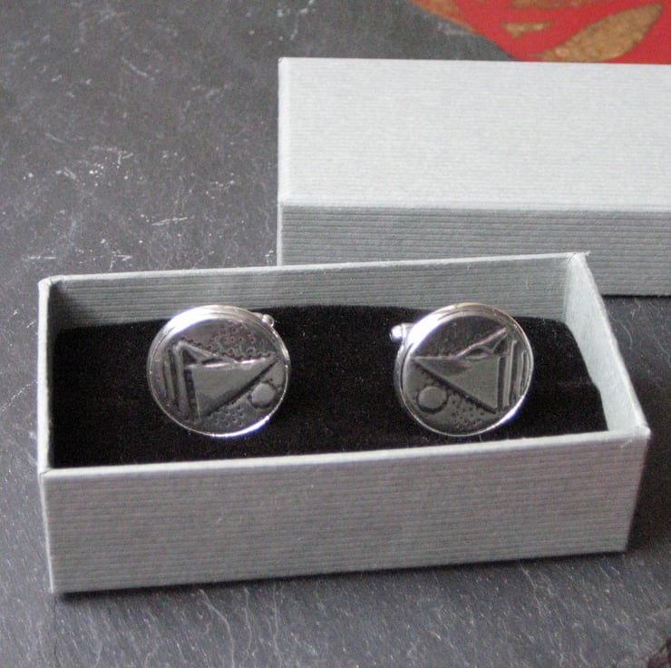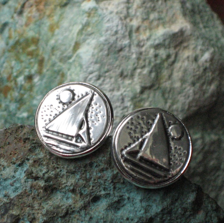 Nautical sailing boat cufflinks in silver pewter. For a man who loves the open water, the outdoors and water sports, these shiny handmade pewter cuff links would be a great accessory. Embossed with a sailing yacht, each link measures 21mm across. The pair comes in a smart grey gift box for presentation for a 10th Wedding Anniversary, Birthday, Christmas or to say Congratulations or Good Luck.
