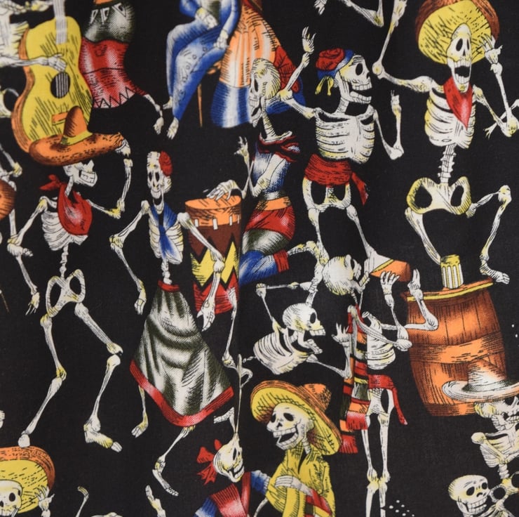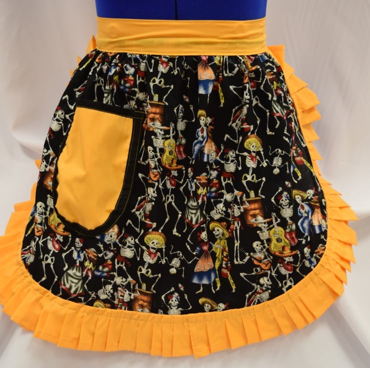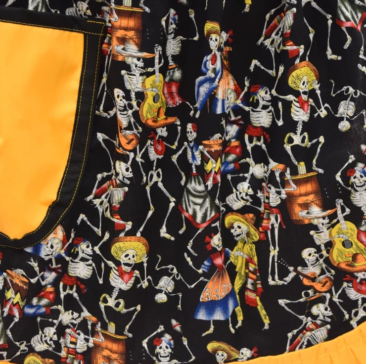 Here we have a lovely cotton rich, black, "Day of the Dead" with orange trim retro style apron, handmade in house to our own design. (see photos). Adjustable waist ties so will fit up to a size 22.