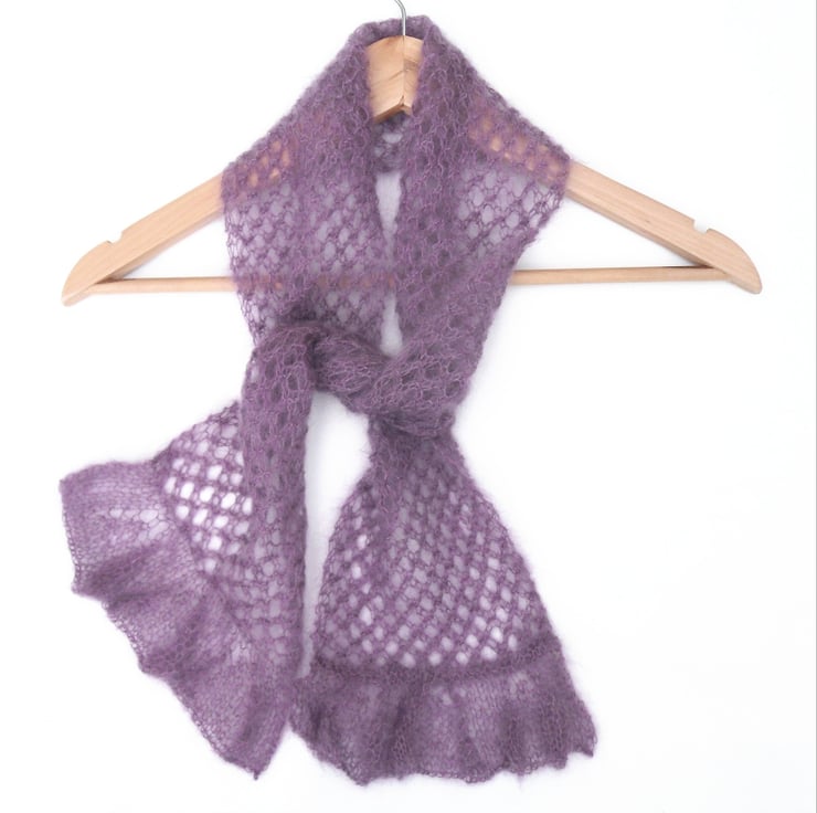 Beautiful feminine hand knit dewberry lilac purple delicate lightweight scarf. Hand knit in Rowan kidsilk haze yarn (70% super kid mohair , 30% silk) , beautiful and soft to the touch with a wonderful fuzzy haze.