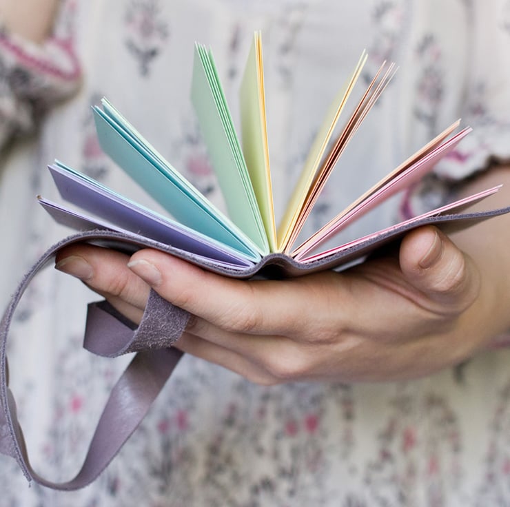 Six gorgeous and carefully selected pastel shades (pink, orange, yellow, green, blue and purple) blend together beautifully to create these rainbow pages. Bound into your choice of leather (please note that the neutral and lighter tones work better with the paper colour, but it's obviously your choice!).
