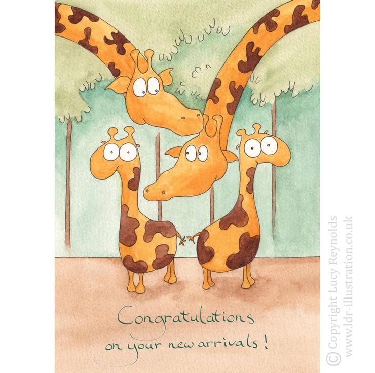 A5 size and supplied with a white envelope. The front of the card reads 'Congratulations on your new arrivals!' and the inside left blank for your own message.