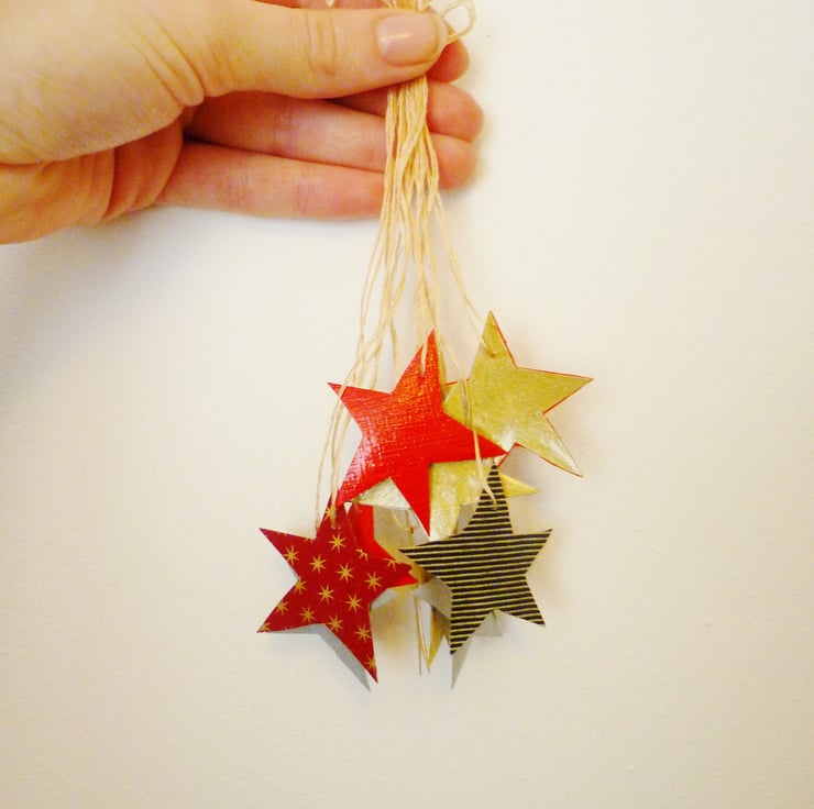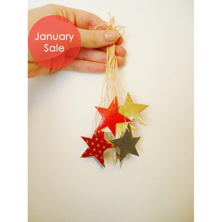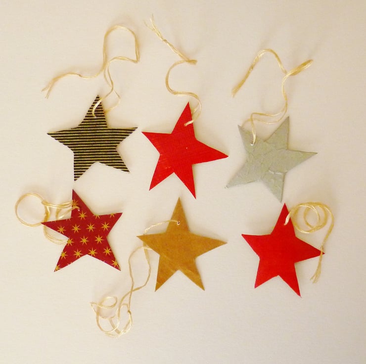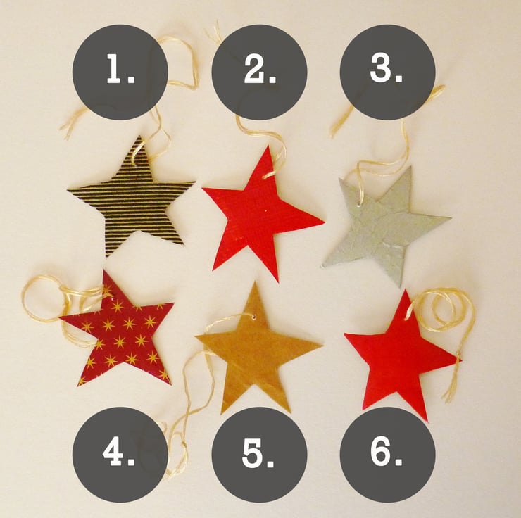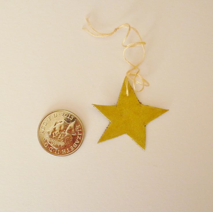Each of these weeny little star decorations is painted gold on one side and collaged with different papers on the other side. All of the options are shown in the picture above, and unless you ask for a particular one (the colours I have in stock are listed below) I'll send you a random colour!
