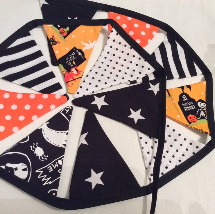 Halloween bunting that can be used year after year, and with a mix of black and orange fabrics, and a trick or treat fabric with a ghosts and pumpkin, they are all here on this 12 flag bunting can become a family favourite.