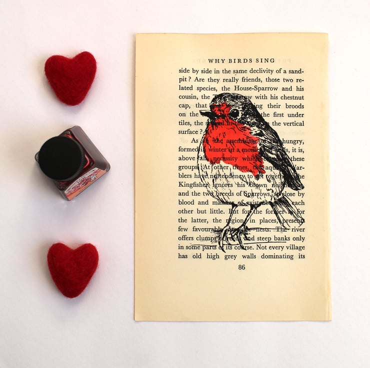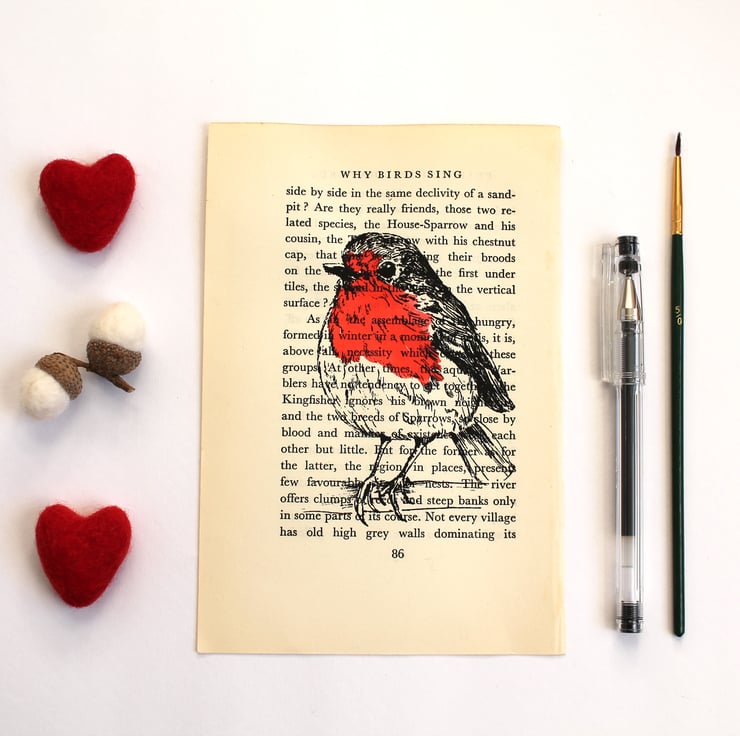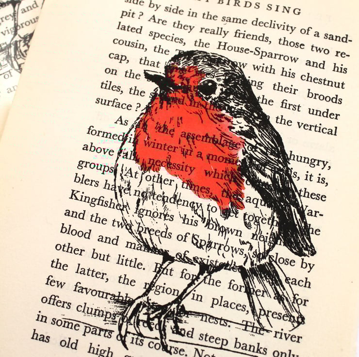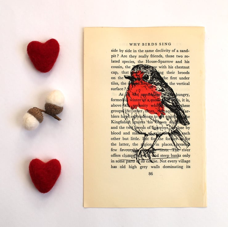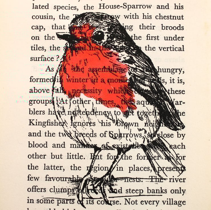 Each robin is screen printed on a unique vintage book page from books dating back to 1933 and then hand coloured with ink to give the robin his bright red, distinctive breast.