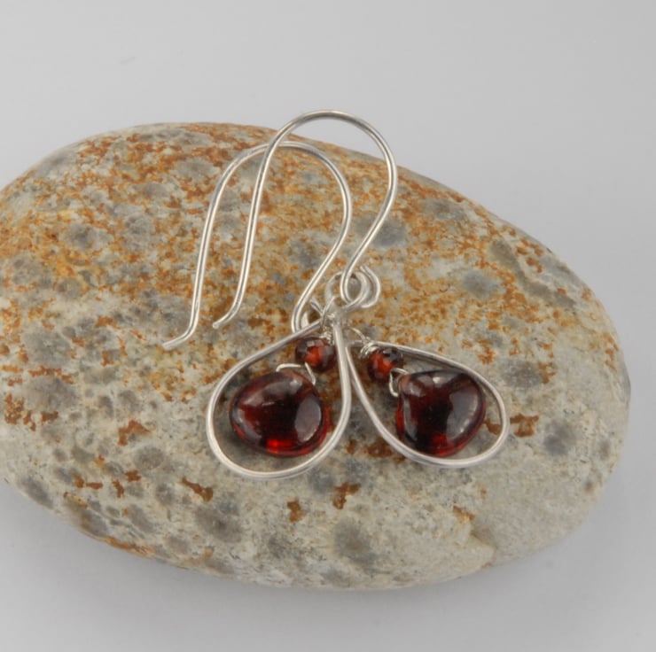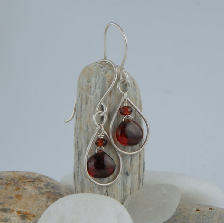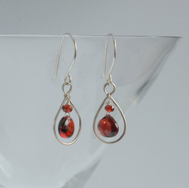 These drop earrings feature drops of red wine coloured garnet which hang within a sterling silver frame and they are completed with hand made hooks (also sterling silver). The openess of the earrings allows light to flow through the garnet and show off the lovely rich red colour. The frames have a satin finish to them. I think these earrings would work equally well at the office or going out in the evening.