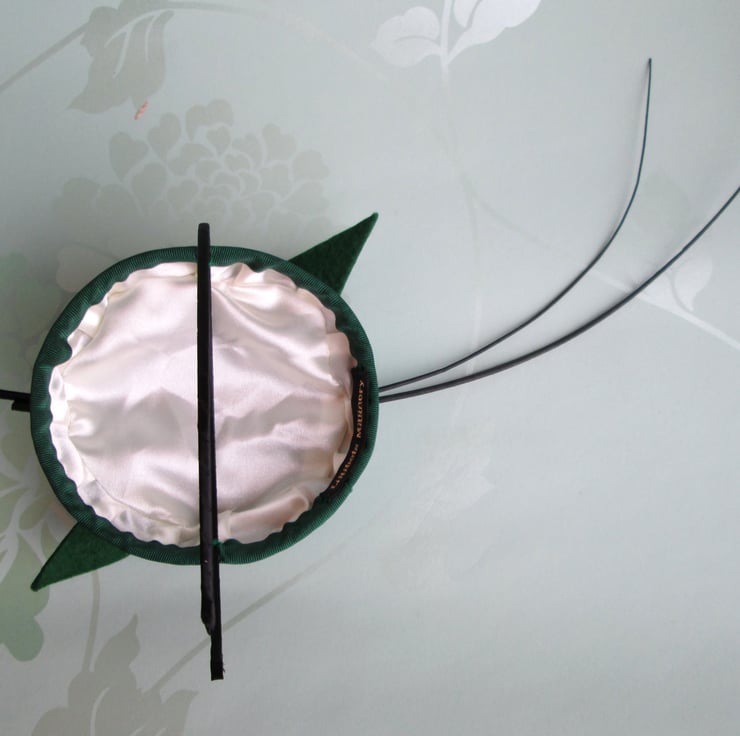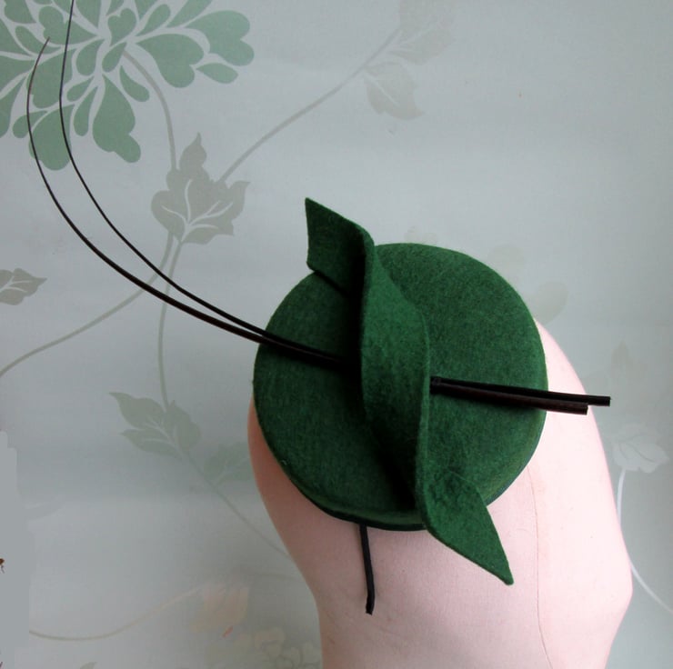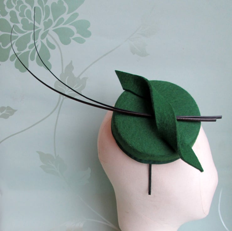 Green occasion hat handmade in pure wool felt. This eye-catching hat has been hand blocked on a vintage pillbox style millinery block then brought right up to date with the addition of two ostrich spines and felt swirl. Perfect for race meetings, wedding and more formal occasions.