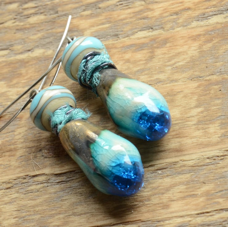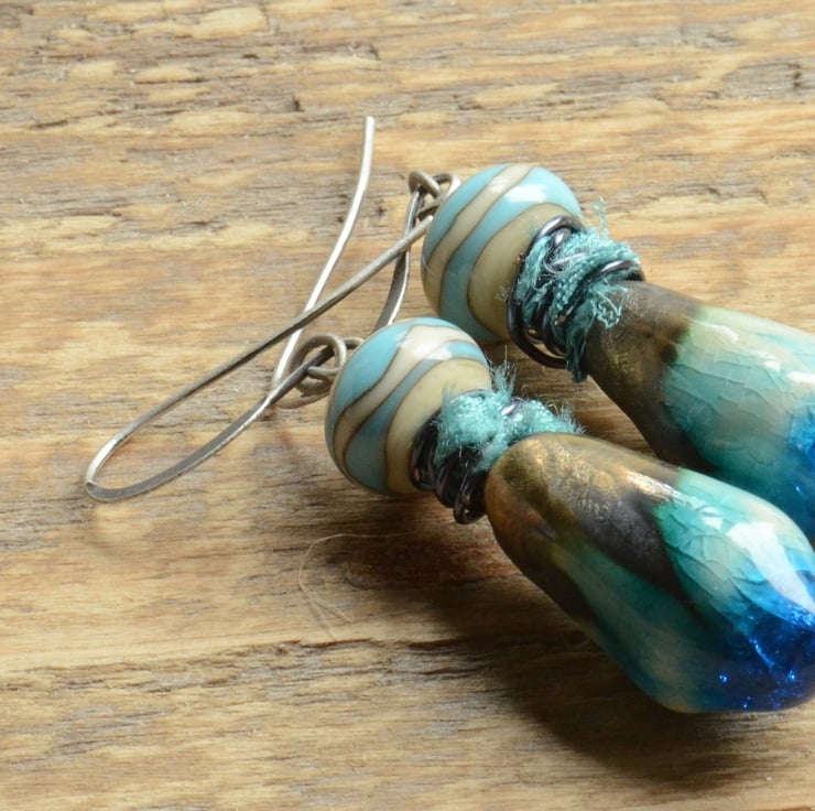I have used stunning turquoise blue ceramic drops as the focal for these earrings teamed with Lampwork glass beads wire wrapped with sari silk ribbon on antique silver grey artisan style earwires.