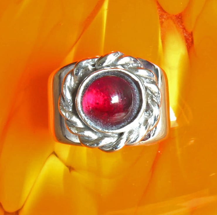 A very fine combination of silver and the deep, translucent red of garnet stone is given with this band ring.