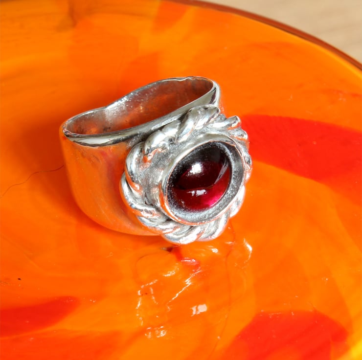 Garnet is a very fine stone, the birthstone for January. The name can be traced back to the ancient Phoenician word for pomegranate. Framed and garlanded here in coiled silver this ring does have an air of far-off times.