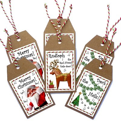 This set of 6 luxury Christmas ‘festive funnies’ gift tags utilise some of the images that appear in my Christmas card collection; a jolly Santa toy (singing ‘ho! ho! ho! Merry Christmas’), a Scandinavian wooden dala horse (dressed as ‘Rudolph the Red-Nosed Dala-deer’) & of course boughs of holly with a Christmas tree (‘Deck the Halls’).