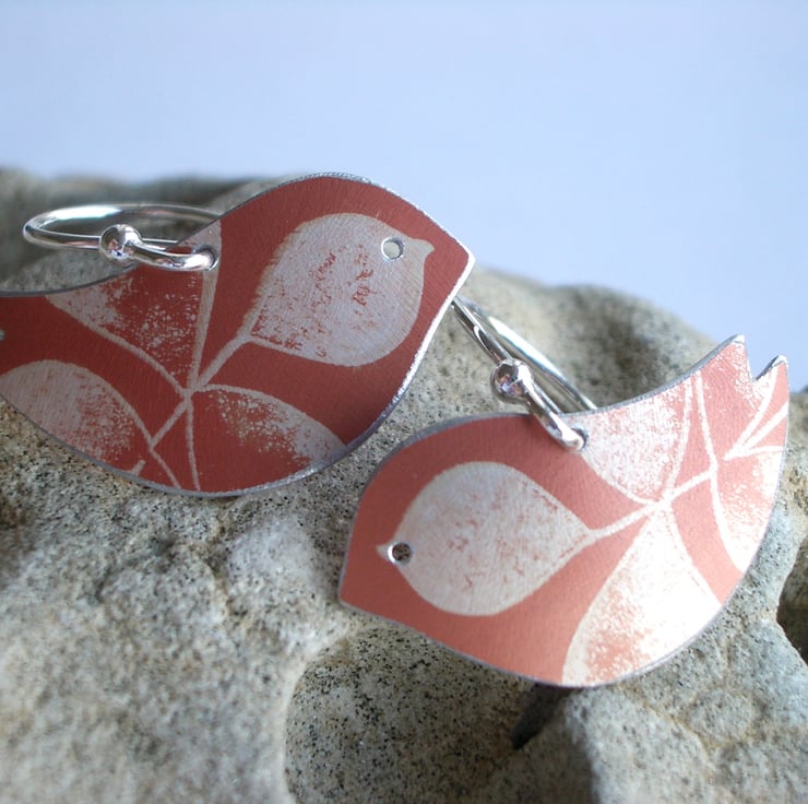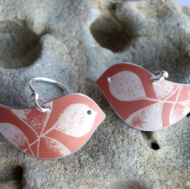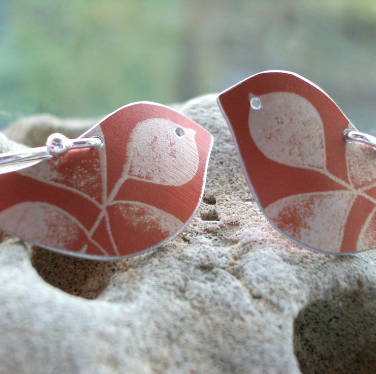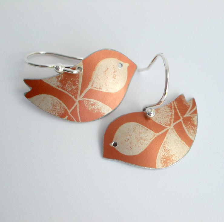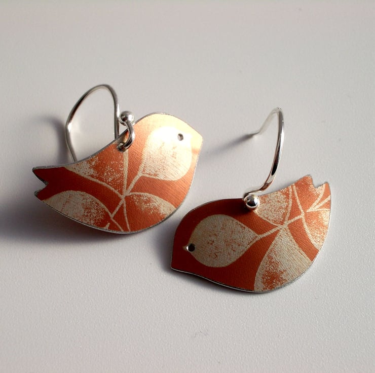 These autumnal little bird earrings are made from aluminium which I have dyed in a mellow copper colour with leaf prints. I seal the dye so that it becomes a permanent part of the metal. I then saw pierce the bird shapes by hand and dome them slightly so that they catch the light.