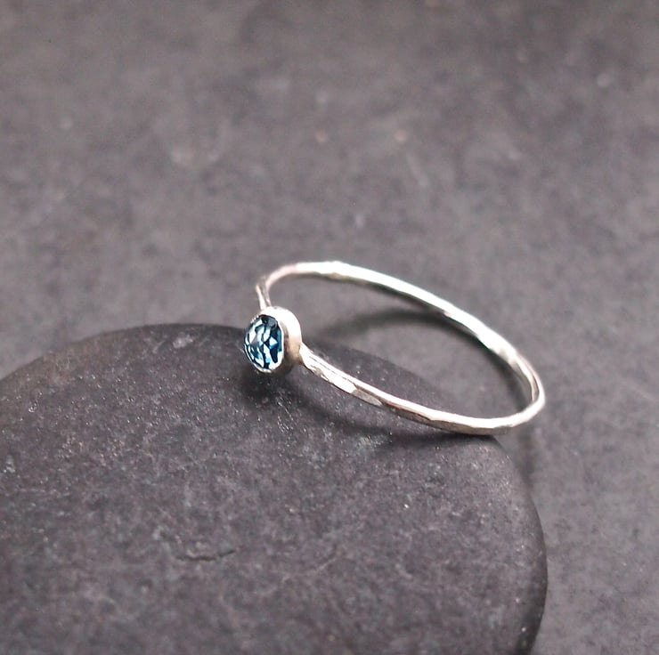 A wonderful deep blue facetted 4mm cabochon on a 1mm beaten ring. This is the London Blue and is rose cut for sparkle.