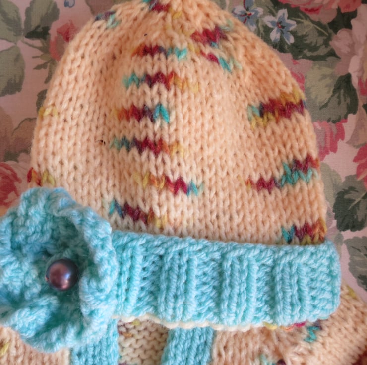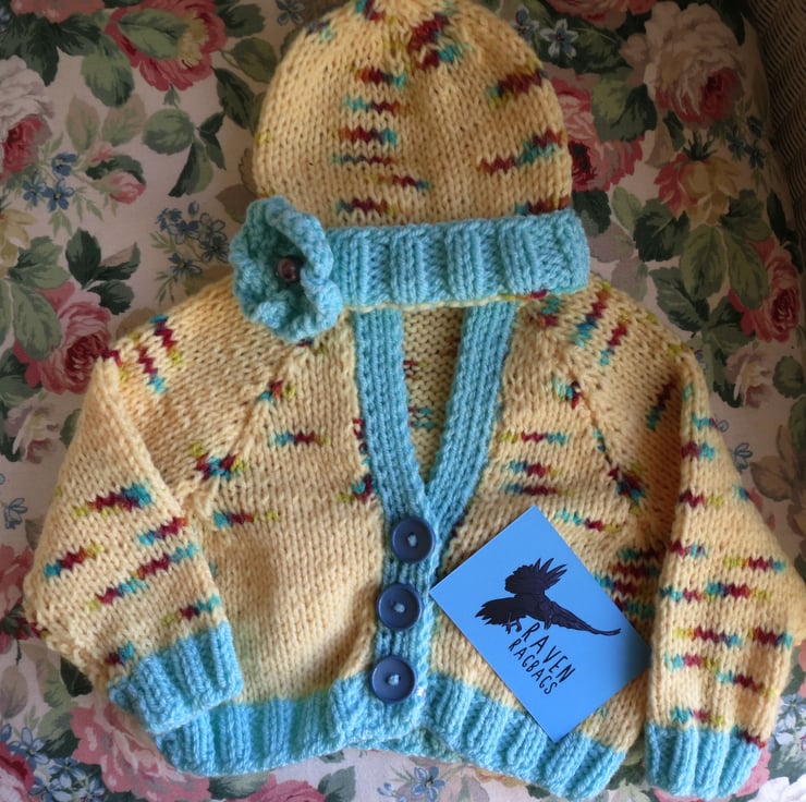 Cute little baby cardigan in yellow acrylic yarn with random blue, red and orange pattern to fit 16" to 18" chest, approximately birth to 3 months, with a matching beanie hat. The cardigan has contrasting blue ribbing and the little hat has a baby blue knitted flower with bead centre. Just the job for those cold Winter days to keep baby warm and snug. Very soft feel for baby's comfort and very stylish too. This garment will wash at 30 degrees C.