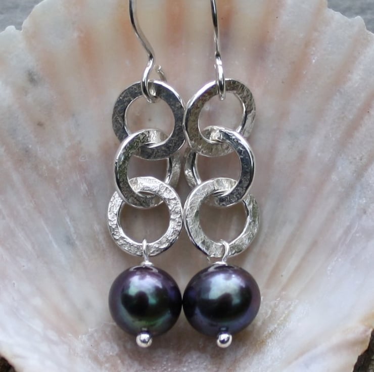 Sterling silver and fresh water pearls have been combined to make these stylish contemporary earrings. Suitable for work or evening wear, the textured silver jiggles and catches the light beautifully.