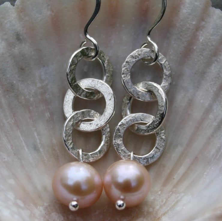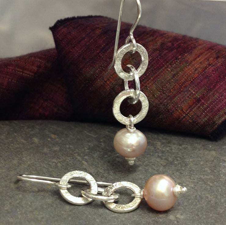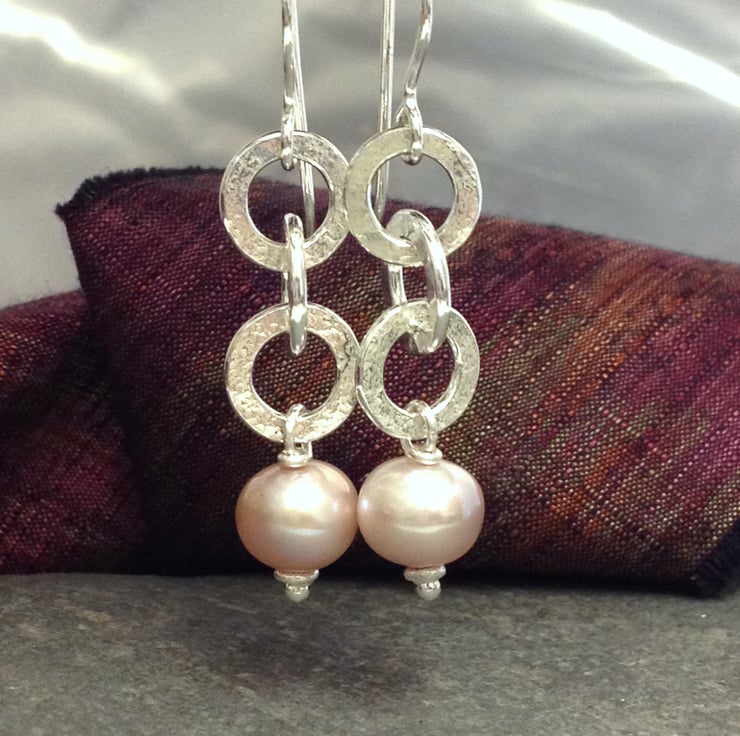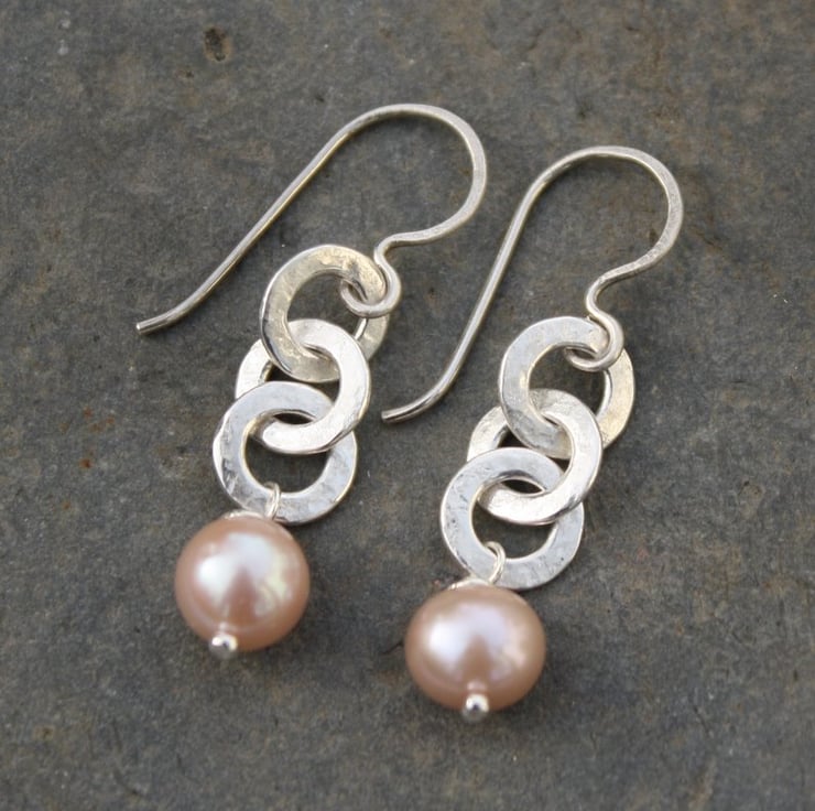 These lightweight , comfortable dangly earrings have three forged textured chain links leading to a plump pale pink 8mm pearl. They hang from handmade hook earwires.
