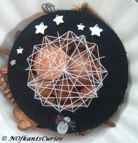 The mother of pearl shell stars have been sewn on in an abstract arrangement and a yarn and mother of pearl stylised spider has been composed with two rounded discs.