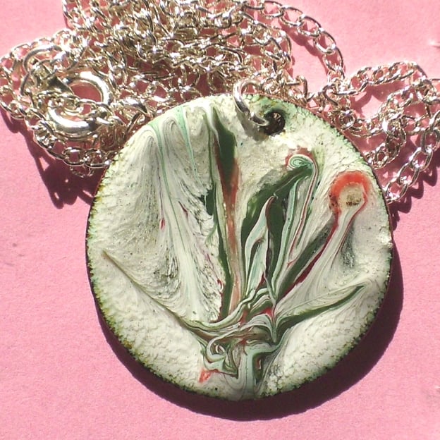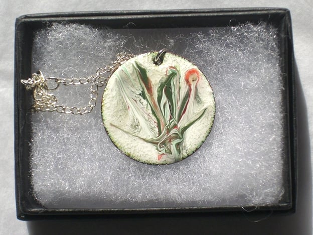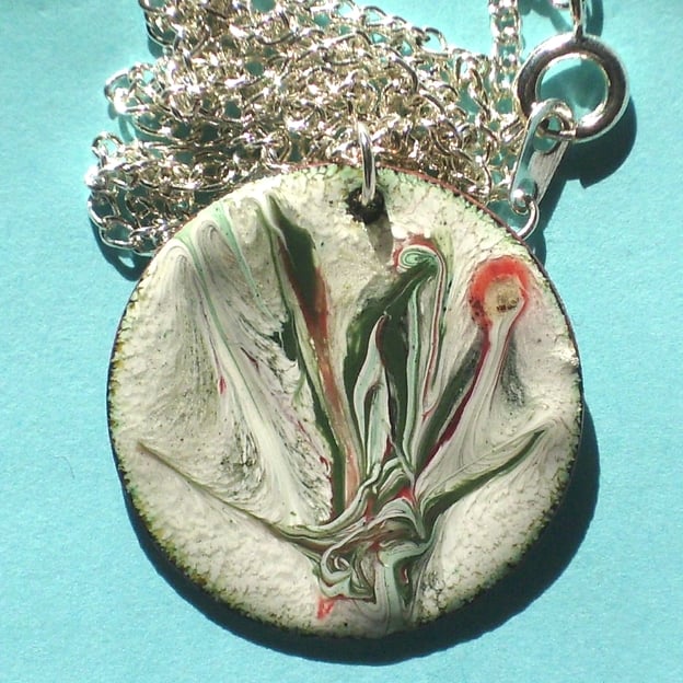 I made this pendant by drawing through the colurs while the piece was in the kiln, at red hot. The pattern is random in the sense that I have minimal control over the material and the action of the tool. The technique imparts a degree of texture to the piece in as much as the enamel will not necessarily flow flat after it has been disturbed but because of the nature of glass it will set smooth.