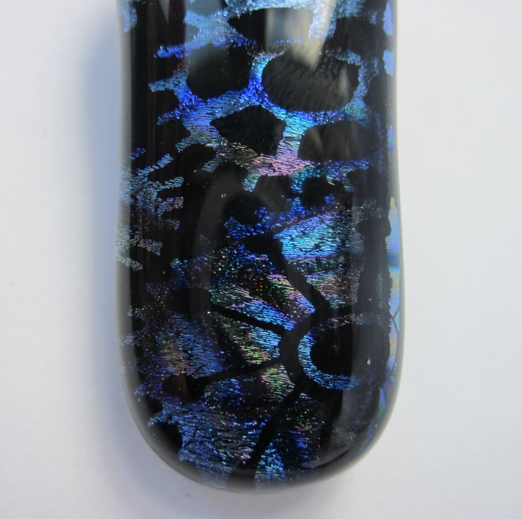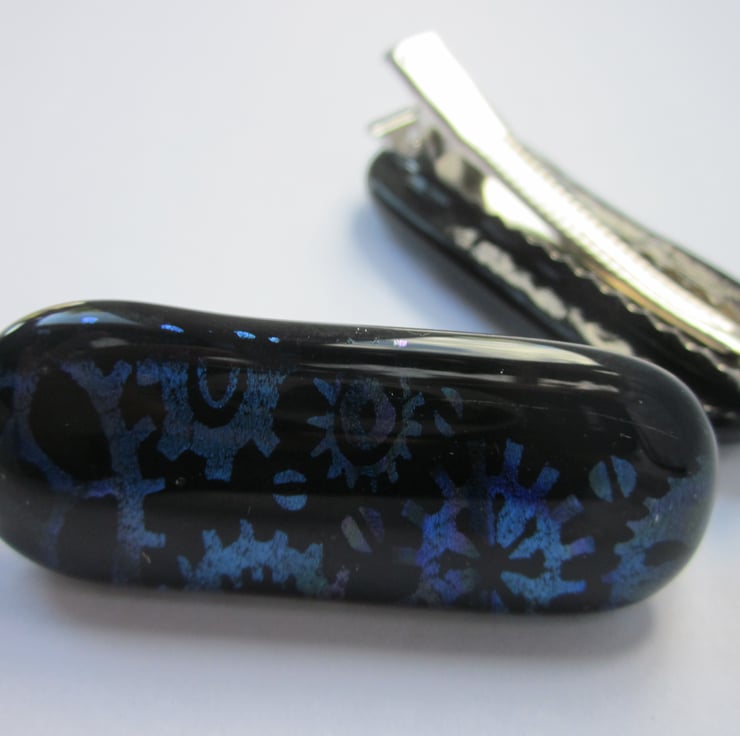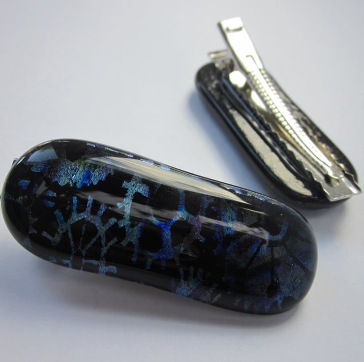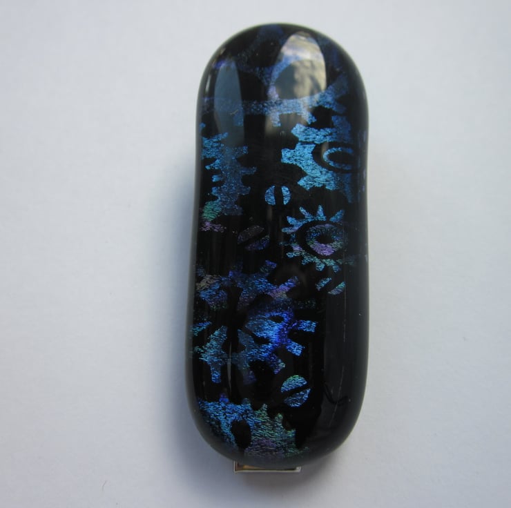 These cabochons have a fabulous steam punk design of cogs on a black background. The dichroic is a beautiful mix of blues, teal and purple. They are fitted with silver metal crocodile clips. These are approximately 5.5cm long. They might also be used as a brooch or to fix a scarf.