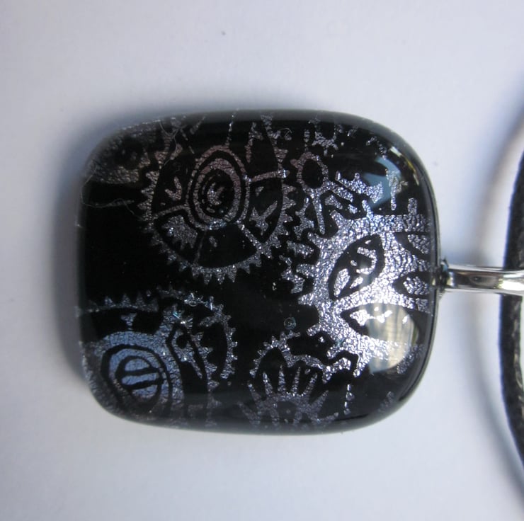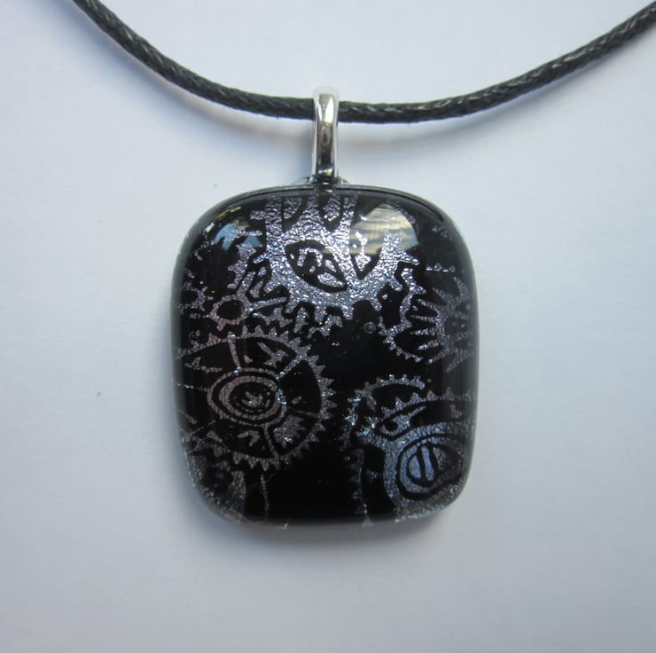 This glass cabochon was fused by me. It has a beautiful silver dichroic steam punk design of cogs on a black glass base. It is approximately 1 1/2 inch high. It is far more beautiful than in the photograph - it is impossible to do justice to the shimmer. This pendant has a silver coloured metal bail.