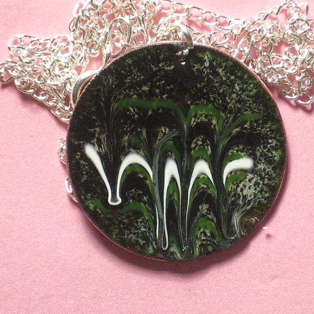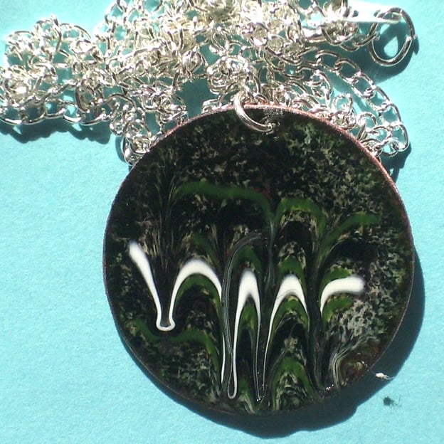 I made this pendant by drawing through the colurs while the piece was in the kiln, at red hot. The pattern is random in the sense that I have minimal control over the material and the action of the tool. The technique imparts a degree of texture to the piece in as much as the enamel will not necessarily flow flat after it has been disturbed but because of the nature of glass it will set smooth.