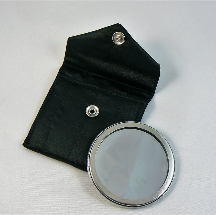 The mirror measures 58 cm (2 1/4") and the pouch measures 7.5 cm x 7.5 cm (3" x 3") and it fastens with a popper.