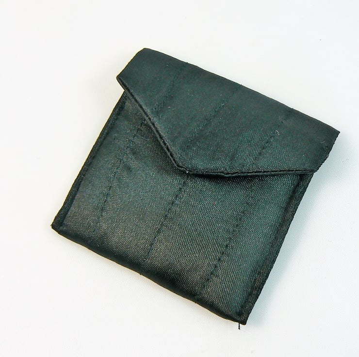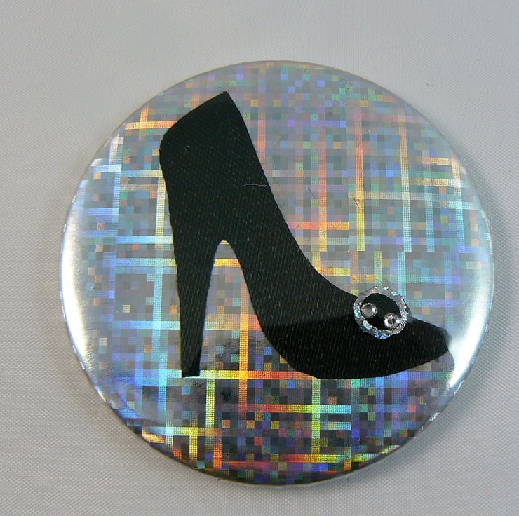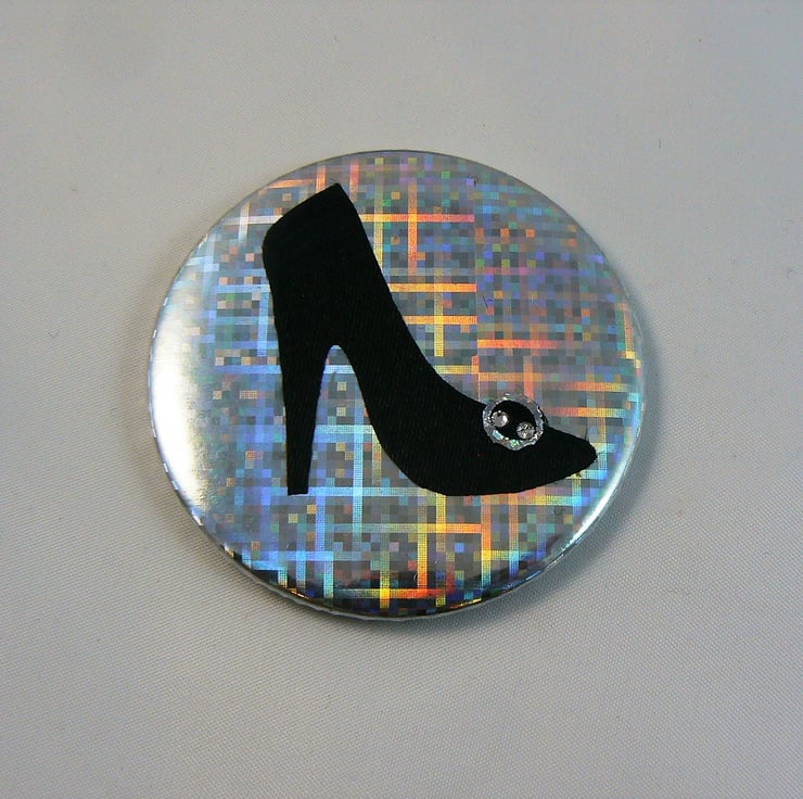 I have made this pocket mirror using black satin for the shoe on a background of silver holographic paper and then used two teeny weeny swarovski. crystals for the buckle, this is protected with a strong plastic film over the top. I have made a slightly padded pouch for the mirror in the same black satin that I made the shoe from.