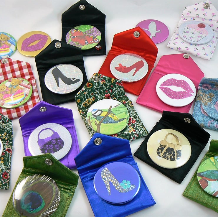 The mirror measures 58 cm (2 1/4") and the pouch measures 7,5 cm x 7.5 cm (3" x 3") and it fastens with a popper.