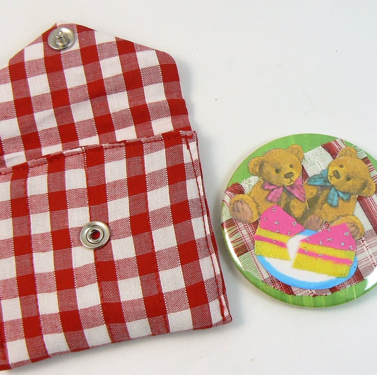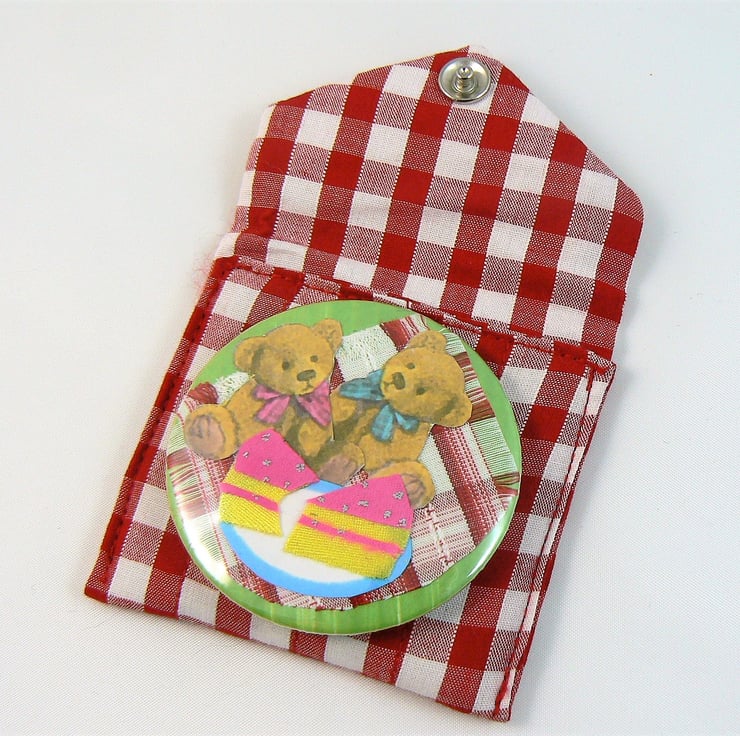 I coloured some paper green for the grass and the whole scene is protected with a strong plastic film. I then make a red gingham pouch to protect the mirror.