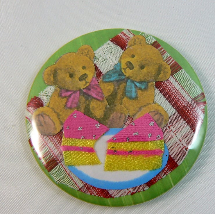 I had fun making this mirror! I wanted to make a little teddy bear's picnic scene, one of the paper teddies has a blue bow and one I gave a pink bow, I have sat the teddies on a little piece of gingham fabric for the blanket and pulled threads along the edge to make a fringe. The cakes are made of yellow material and the topping is pink material with silver glitter on top - yummy - as you can see one of the teddies has taken a bite already!