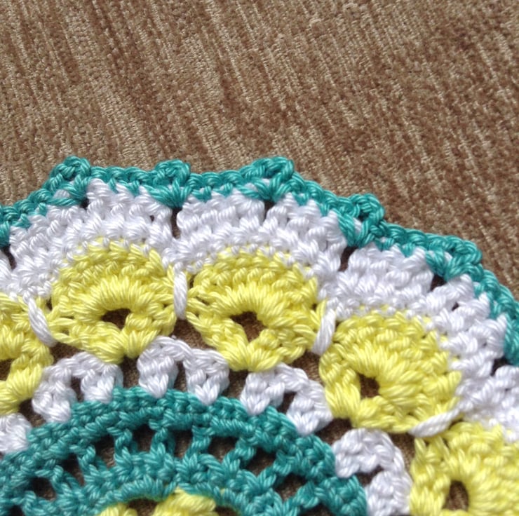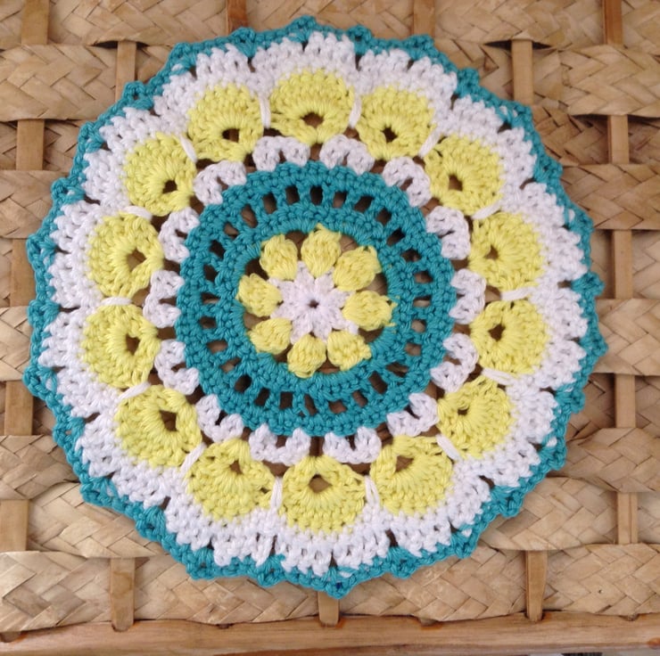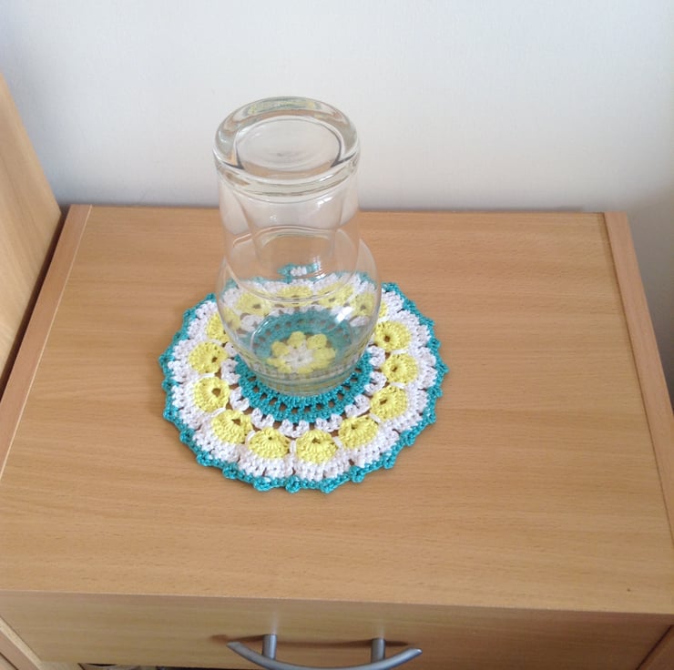 This colourful mat has been crocheted in citrus yellow,turquoise and white that really work well together. It has many uses around your home and is both decorative and practical.