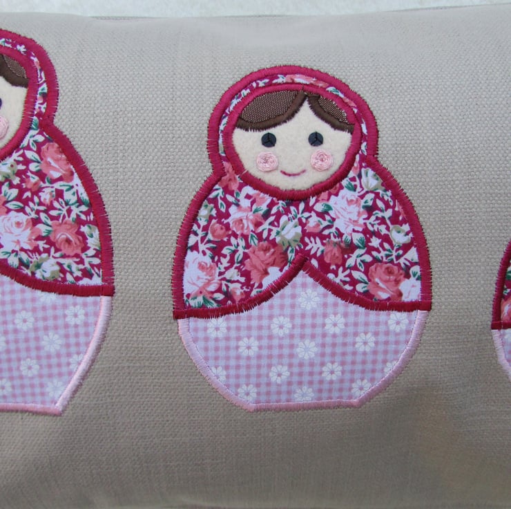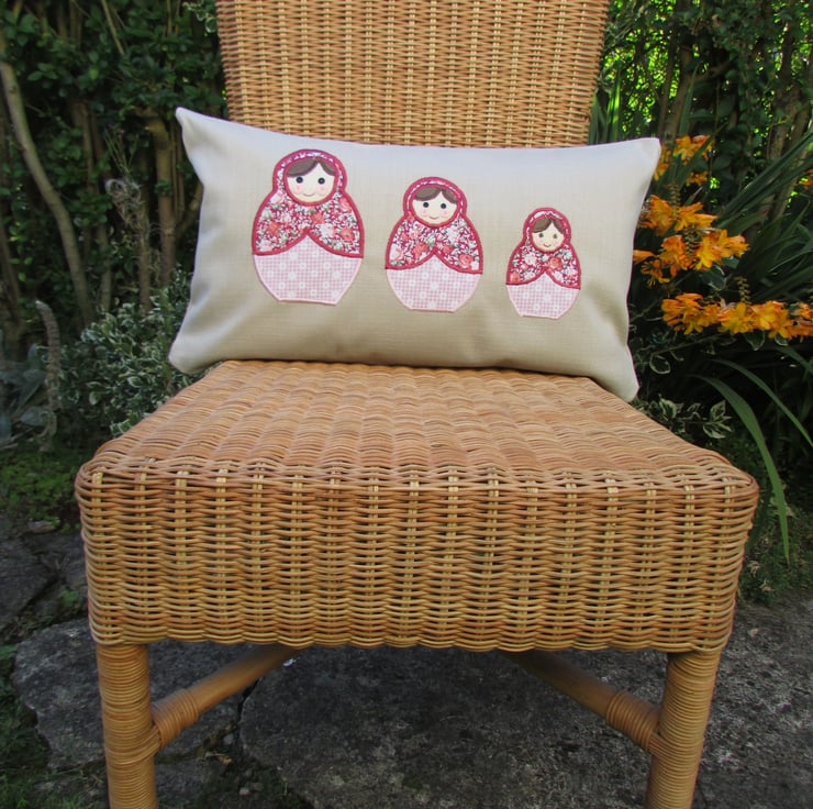 Rectangular cushion in cream fabric with 3 appliqued Russian dolls. The cushion features a set of 3 Russian dolls of descending size. The dolls have been appliqued in pretty co-ordinating red and pink floral print fabrics. Their faces are embellished with black sequin eyes and their mouths and rosy cheeks have been lovingly hand-embroidered.