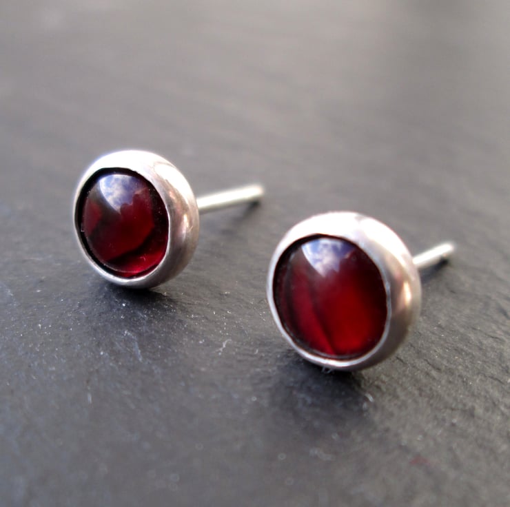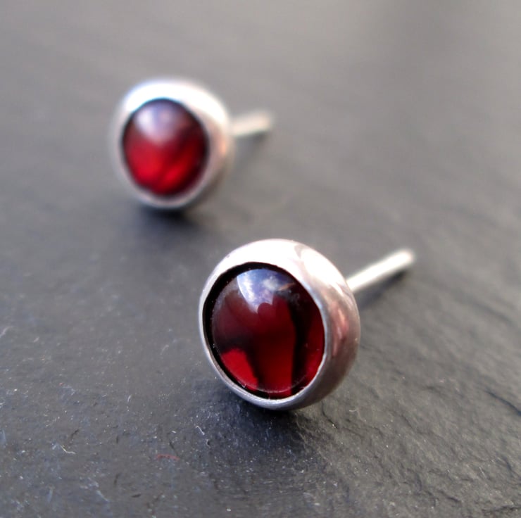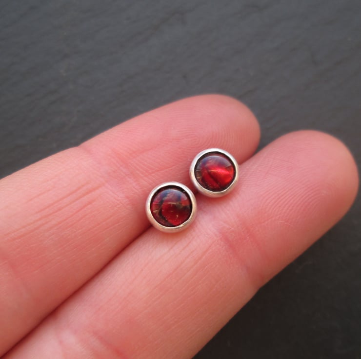 Sterling silver stud earrings with red abalone shell settings. Each earring (6mm across) is crafted by rubbing the silver over the 'stone' to give this pretty pair of studs that are perfect for everyday jewellery. They make lovely gifts and come gift wrapped as standard.