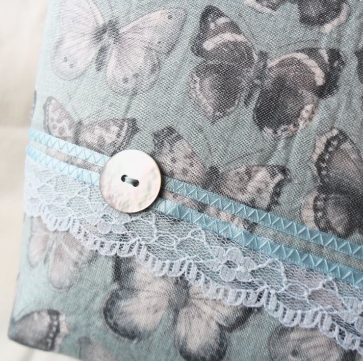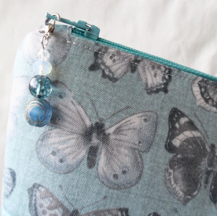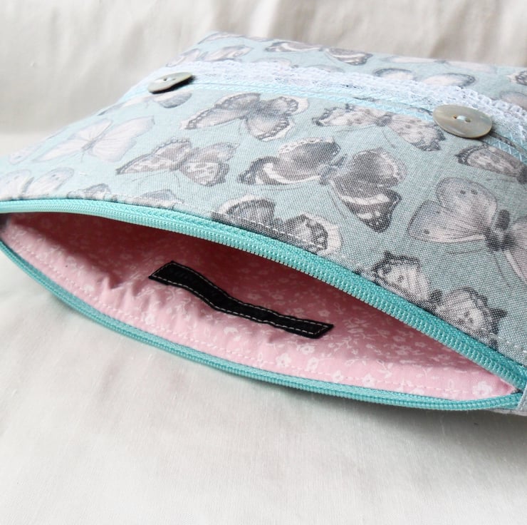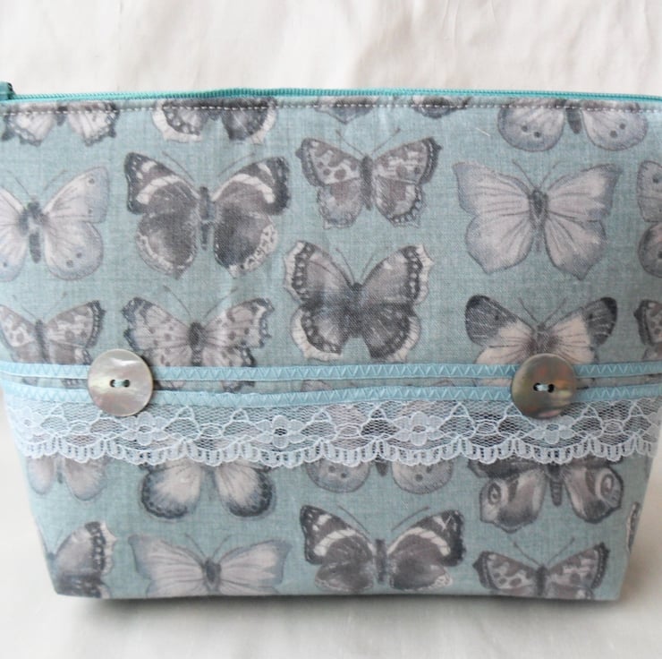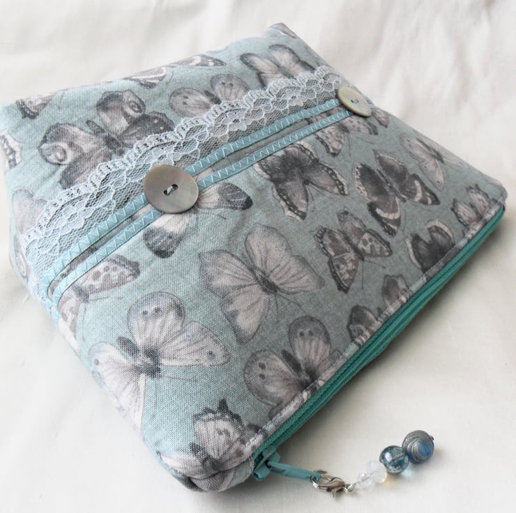 Handmade in a lovely teal and grey butterfly print cotton, this make-up bag is large enough for all your make-up. Both the front and the back are trimmed with lace, narrow satin ribbon and pearly shell buttons. A toning beaded zip pull adds the finishing touch. The lining is a pink and white cotton print.