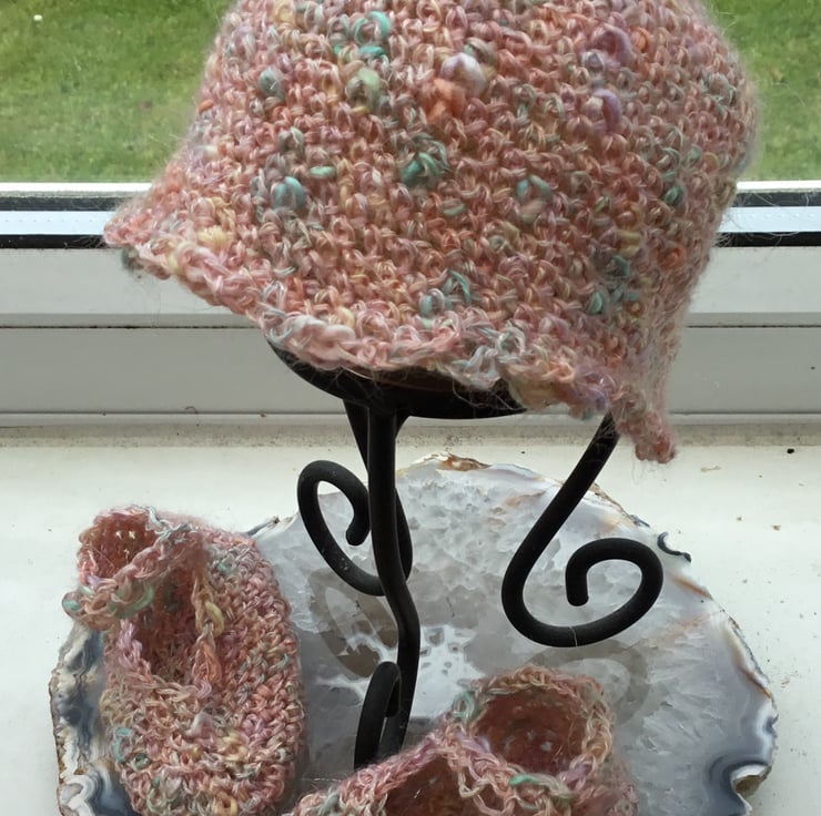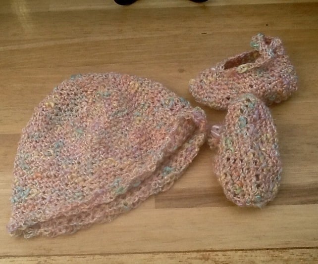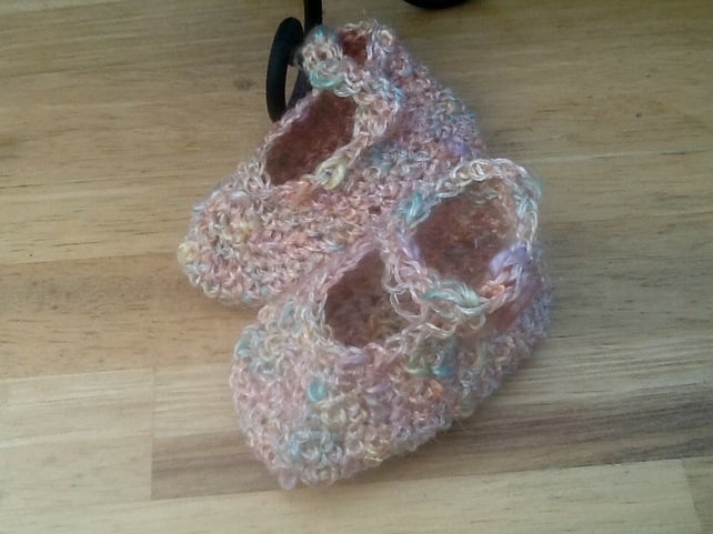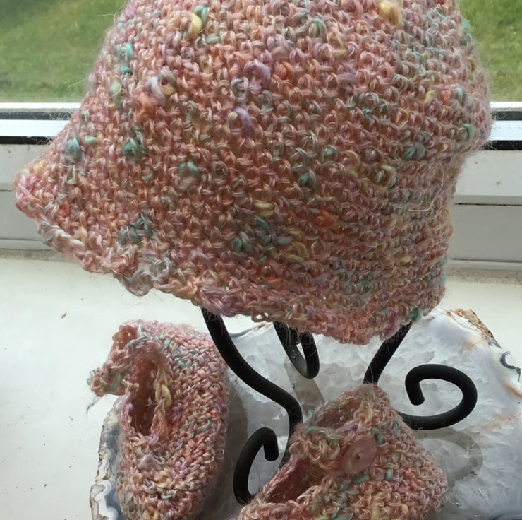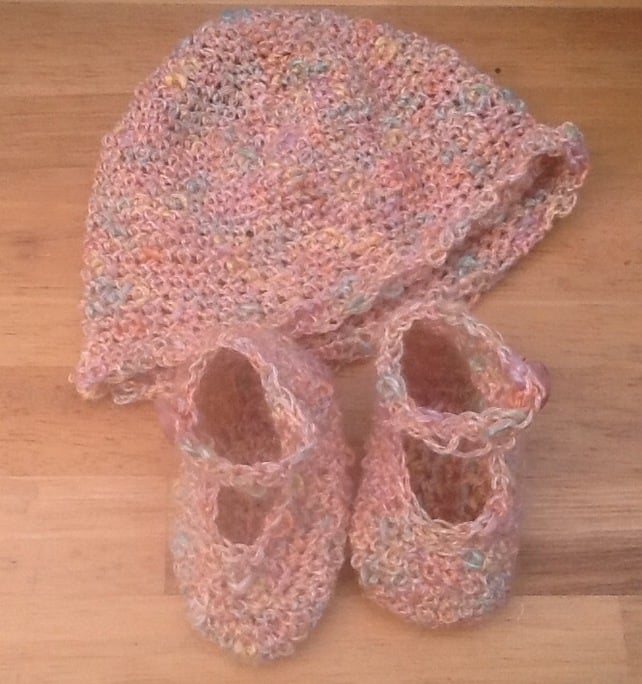 Baby Mirage! Is a pretty little Designer yarn crocheted set, of a little beanie hat and ballet shoes in pale pink mottled acrylic yarn, with blue and green flecks, perfect for a Premature baby and baby up to approx 9lbs.